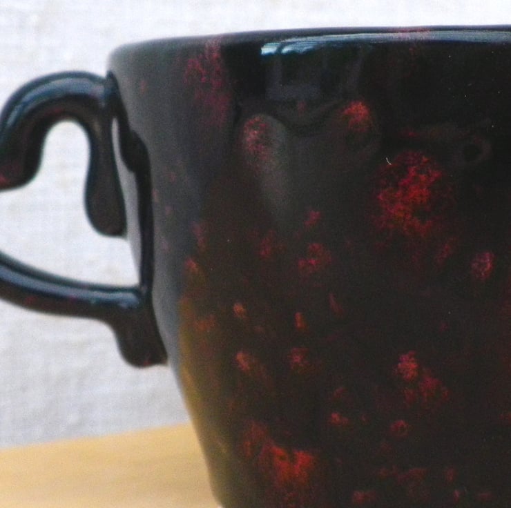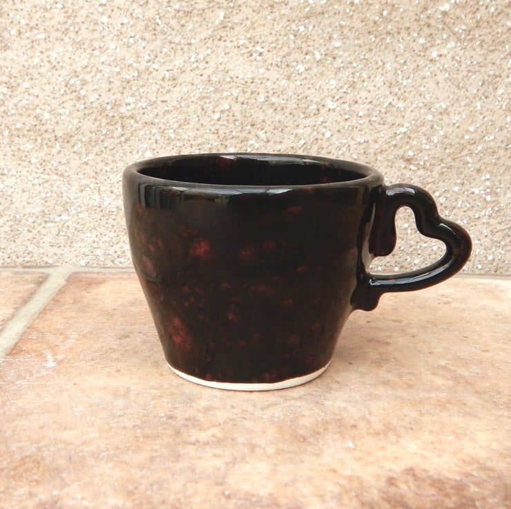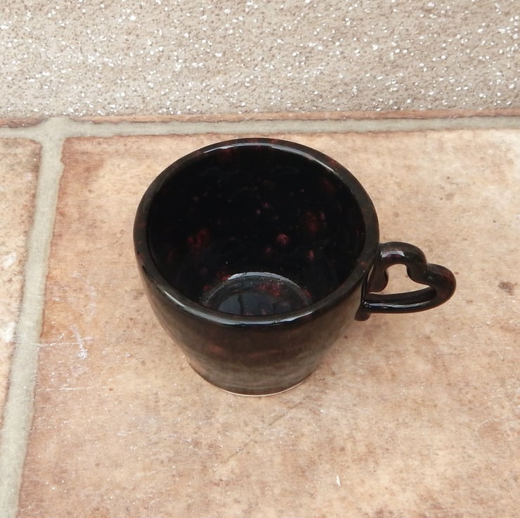 This small cup was slip moulded using white earthenware clay and finished in a gloss black glaze with red crystals in it. It has a sweet little heart shaped handle.