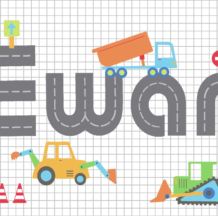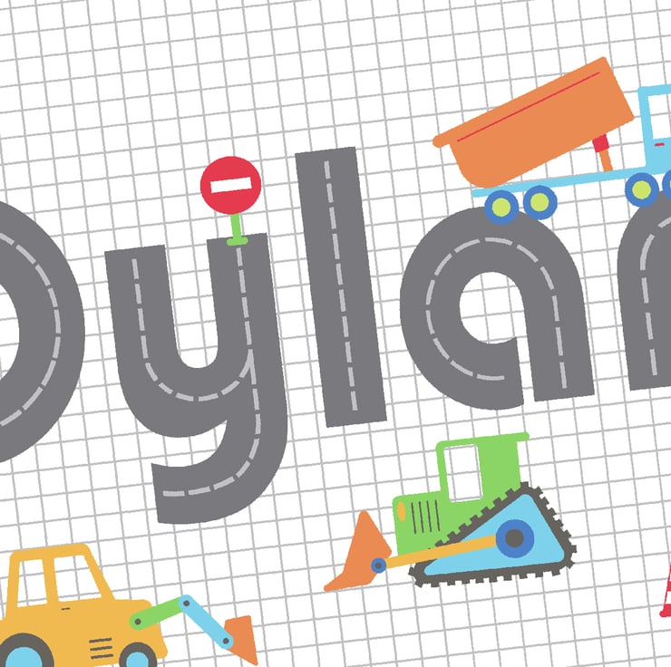This personalised picture is an original, framed print designed to go on a child's door. They look equally great put up inside their bedroom or playroom though! It features diggers and dumper trucks driving around your child's name. What little boy doesn't shout out when they see a digger!