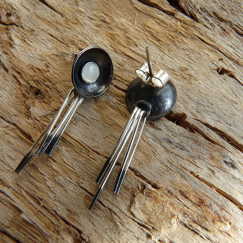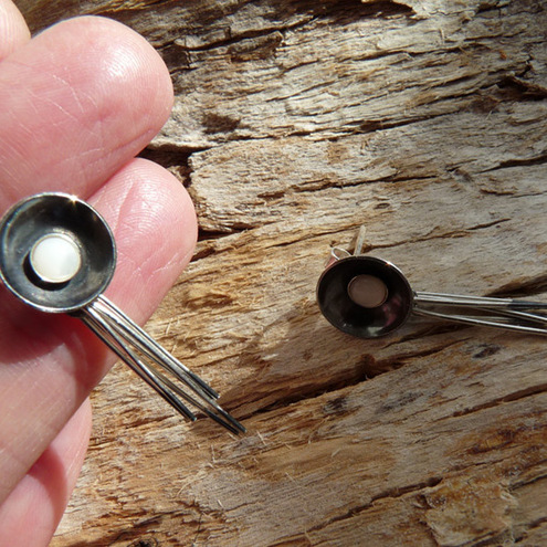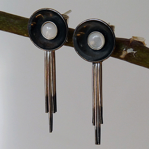 These lovely earrings with Mother of Pearl are completely hand made in sterling silver. The earrings have been polished to a bright and shiny finish. They have been partially oxidized. The earrings have sterling silver butterfly scrolls.