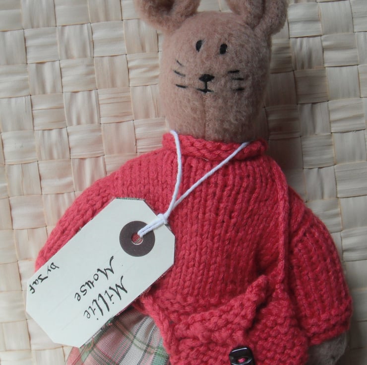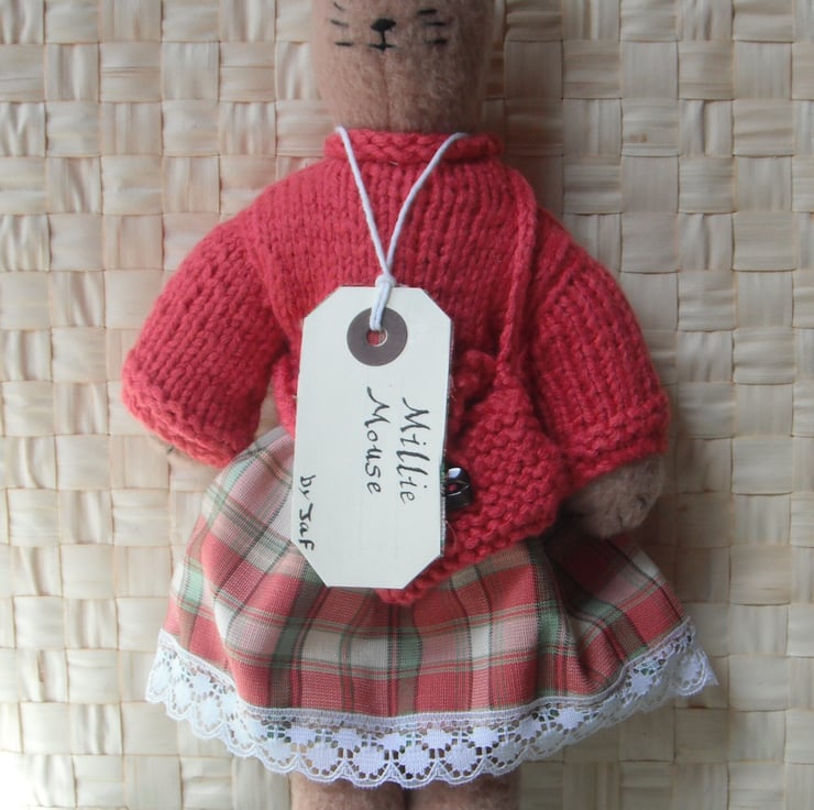 Made from beige fleece with a hand stitched face. She is wearing a hand knitted jumper with matching bag and pretty check material skirt.