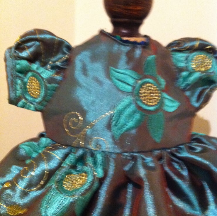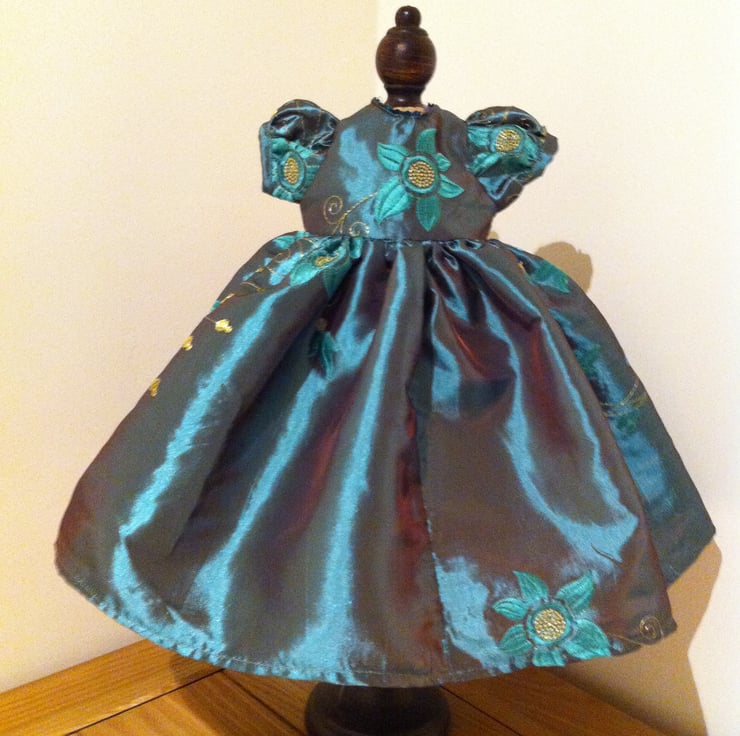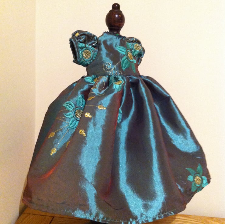 This beautiful turquoise satin dress would make a perfect prom dress for a Maisy Muffin doll. The dress is made from dark turquoise satin fabric embroidered with gold flowers and decorated at the neck and back with cupped sequins. A really pretty outfit for your Maisy Muffin to be the belle of the ball.