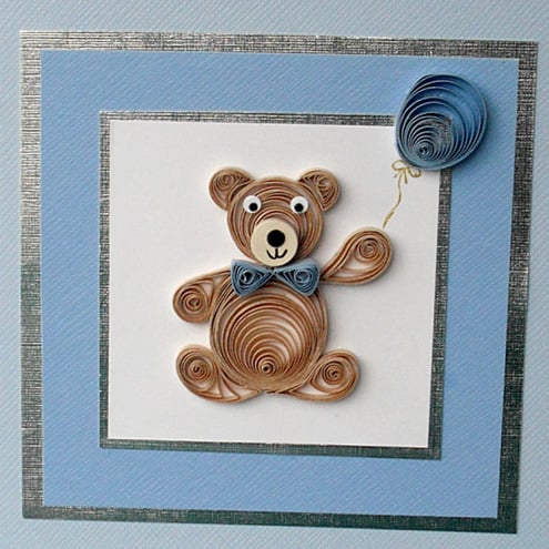 Send your congratulations to new parents with this beautiful new baby birth card featuring a cheeky quilled teddy holding a balloon. The insert inside will be left blank, or can be printed with a message of your choice.