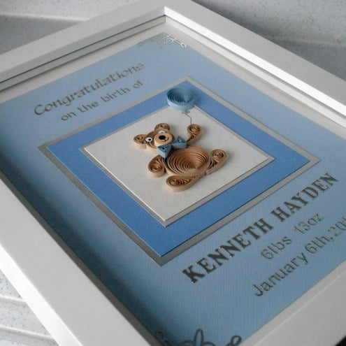 This quilled new baby birth congratulations card can be personalised with name of the new baby and the date of birth. Let me know your personalisation details in the "Notes" at checkout.