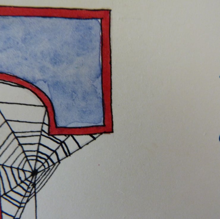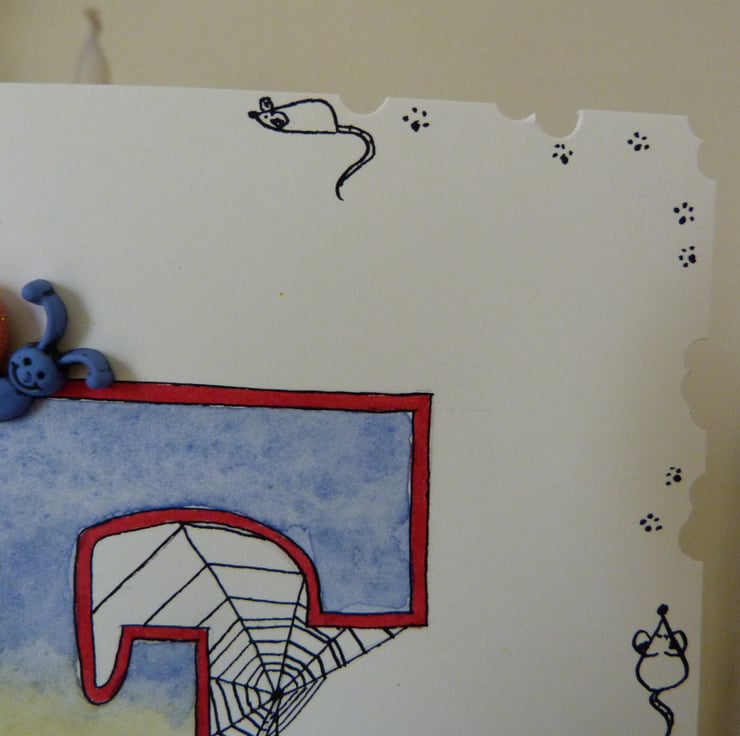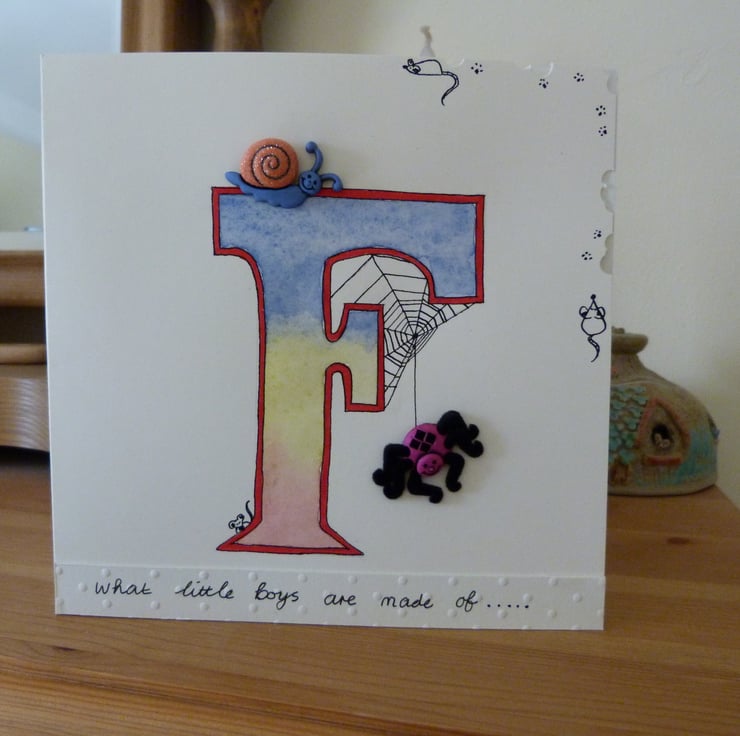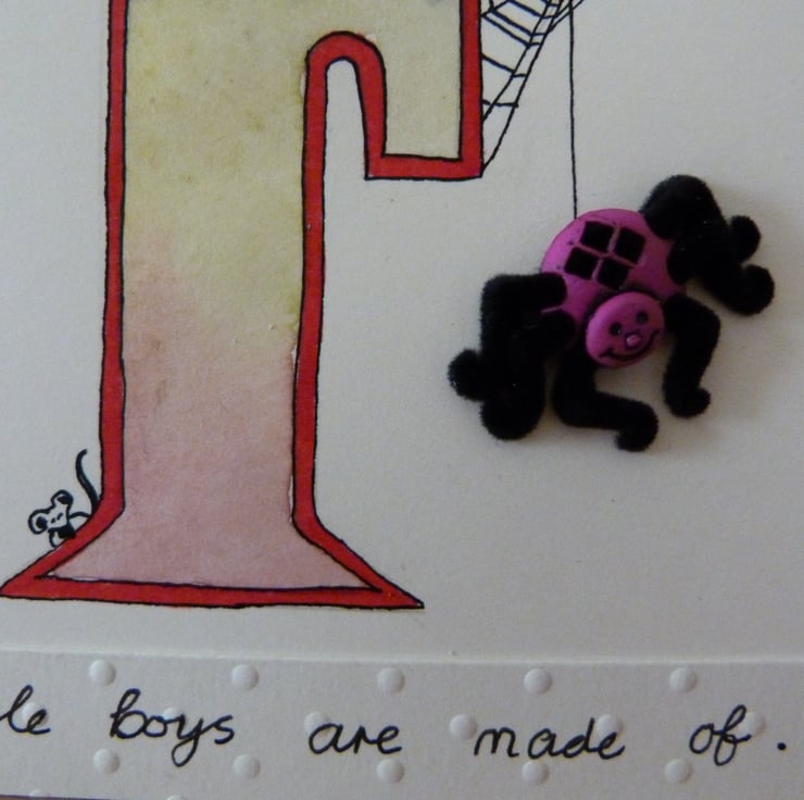 A childs personalised birthday card of an initial drawn in pen and ink and water colour painted onto cream card. A spider web drawn in pen and ink. Embellished with cream dotty embellished card with the words What Little Boys are Made Of. Decorated with plastic spider and snail. Sides of the card punched out to resemble bite marks and decorated with tiny mice.