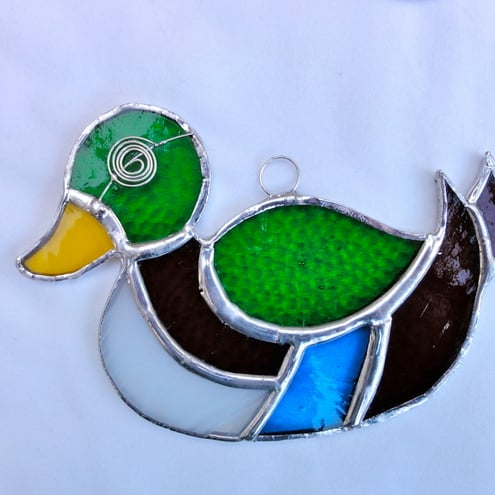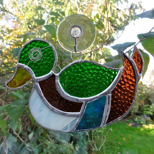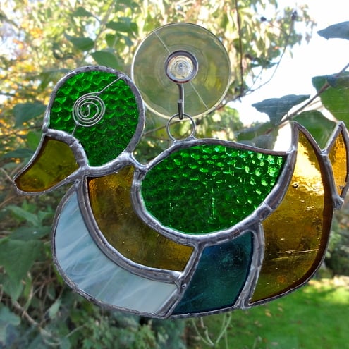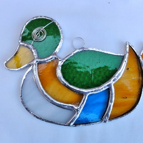 I have ducks made from two different colours; either hammered dark amber or amber streaky glass, green hammered glass, two blue streaky, yellow water glass and wispy white. The eye has been made out of coiled tinned wire. Each piece of glass has been copper foiled and soldered together, a ring has been attached for hanging purposes.