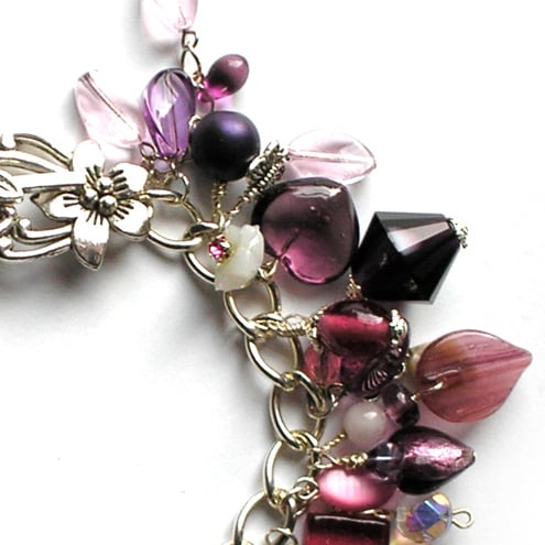 How about a delicious serving of summer pudding to warm the cold spring days? Silver plated bracelet with flower toggle clasp, jam-packed with oodles of beads and charms all lovingly handwrapped by me. This gorgeous recipe contains cranberry and amethyst glass beads, Indian glass roller beads, semiprecious amethyst chips, glass cross and hearts, vintage beads and charms, and lots of Tibetan silver charms and creatures. Random elements will vary due to availability (and just to keep things interesting!) but will always follow the style illustrated. Your bracelet will be lovingly wrapped and carefully packaged to ensure a safe delivery.