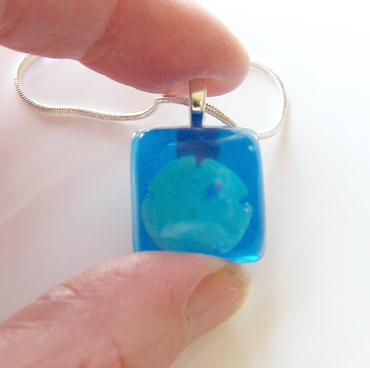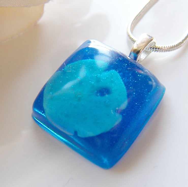 Description: I have added this lovely little sand dollar to UV resistant, non toxic resin then added a touch of blue dye. Pendant measures approx 27mm x 18mm, (approx 1" x just over 0.5") hangs on an 18" sterling silver plated 925 hallmarked chain. So pretty perfect gift for any nautical nature lover:)
