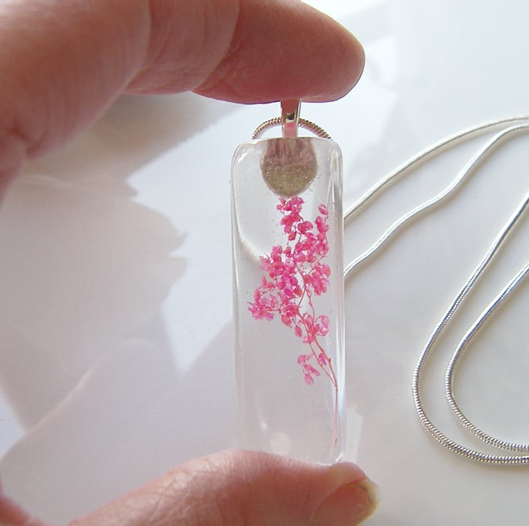 Description: I have very carefully inserted real dried gypsophila (babies breath) (treated to retain colour) before sealing in UV resistant, non toxic resin. Pendant measures approx 50mm x 15mm, (approx 2" x just over 0.5")) hangs on an 18" silver plated chain. ( so pretty, delicate and summery necklace with an oriental feel..