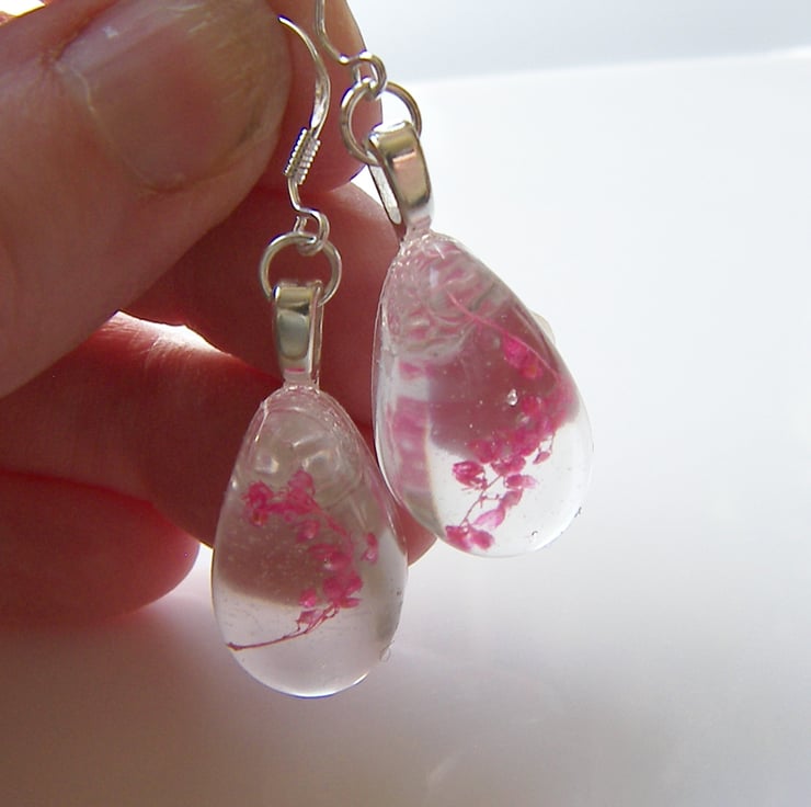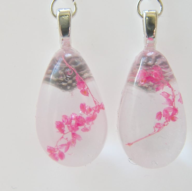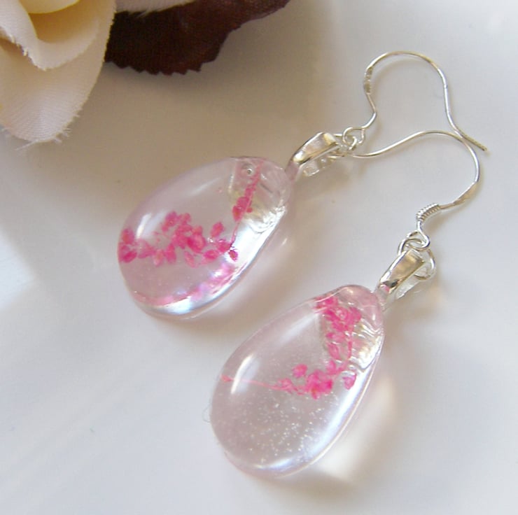 Description: I have very carefully added this pretty pink gypsophila (babies breath) and sealed in UV resistant, non toxic resin.. these teardrops measures approx 20mm x 12mm and hang from 925 sterling silver ear wires. So pretty, dainty and delicate :) perfect gift for spring / summer:)