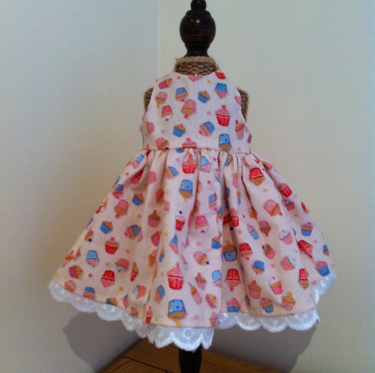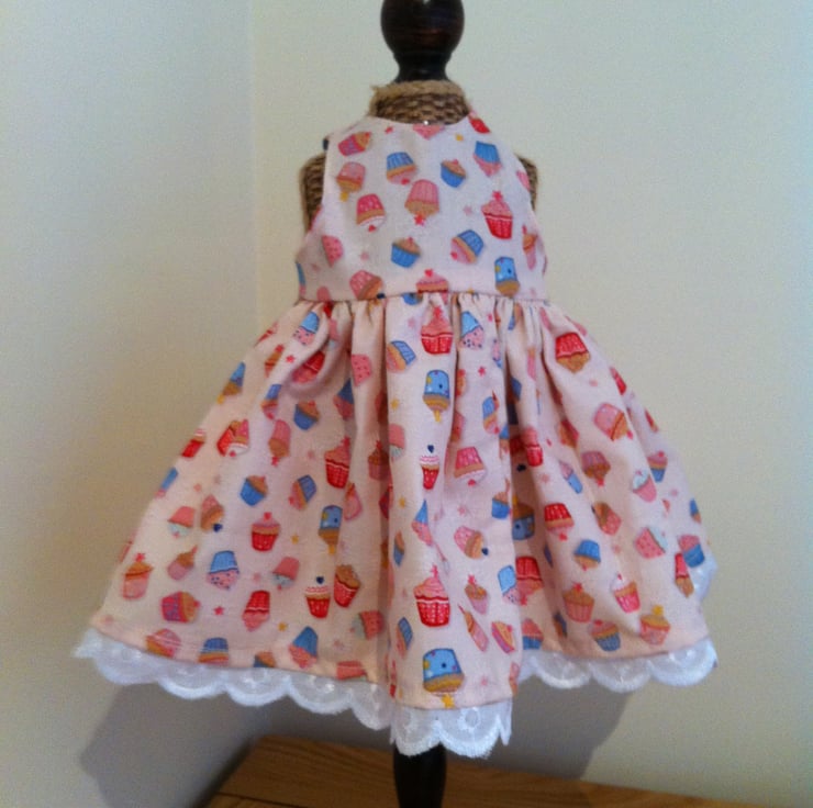 This sweet little sundress is made from pale pink cotton and is covered in tiny cup cakes. At the hem it is decorated with broderie anglais.