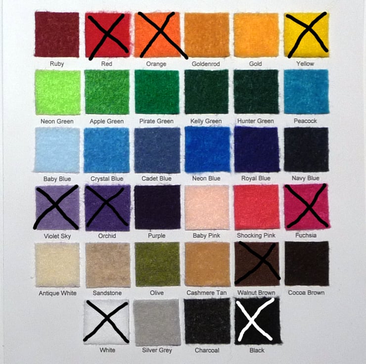 You can choose from the following colours Ruby, Goldenrod, Gold, Apple Green, Pirate Green, Kelly Green, Hunter Green, Peacock, Baby Blue, Crystal Blue, Cadet Blue, Neon Blue, Royal Blue, Navy Blue, Purple, Baby Pink, Shocking Pink, Antique White, Sandstone, Cocoa Brown, Silver Grey and Charcoal.