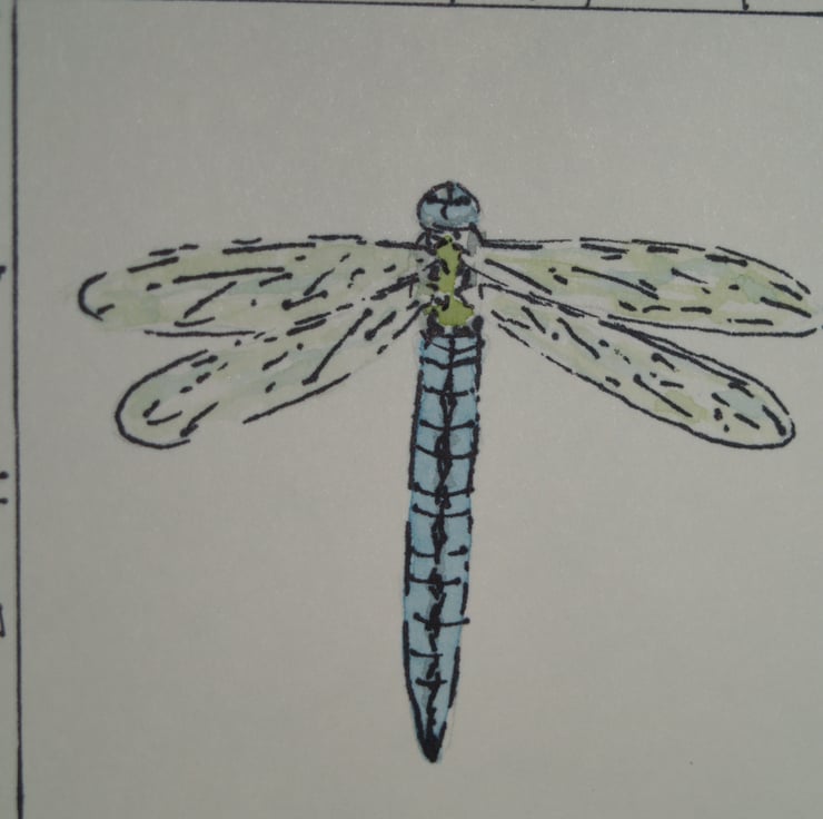 Dragonflies darting around the reeds by the stream give a lovely glimpse of colour. This is my ink and watercolour version of an Emperor dragonfly.