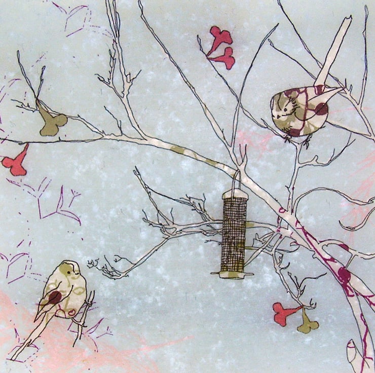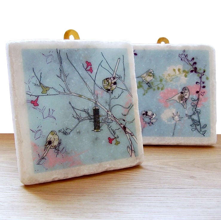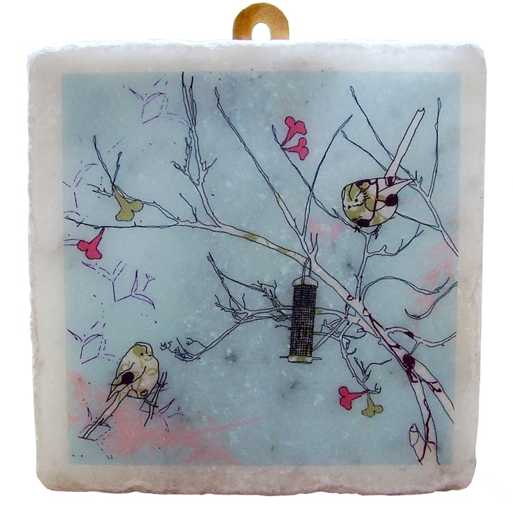 white marble tile featuring an original 'littlebirdy' design to hang on your wall!