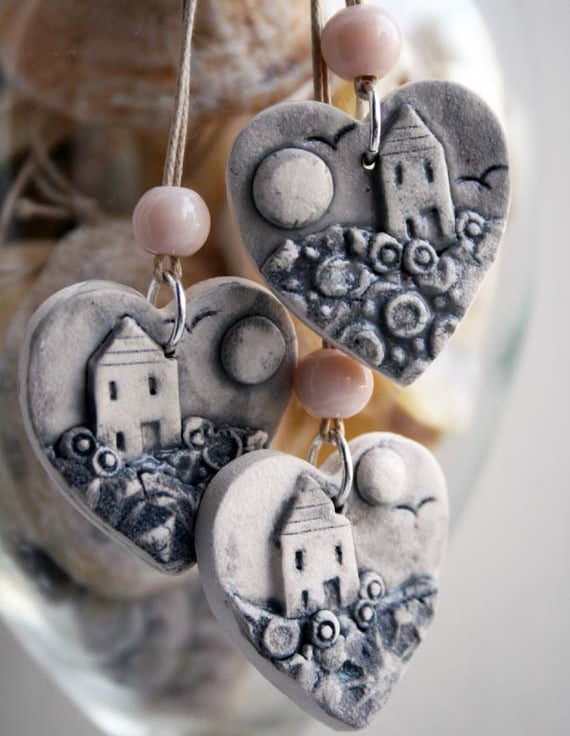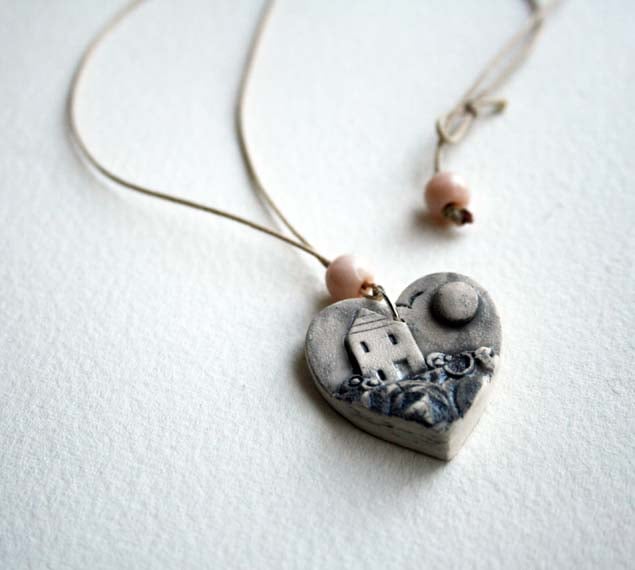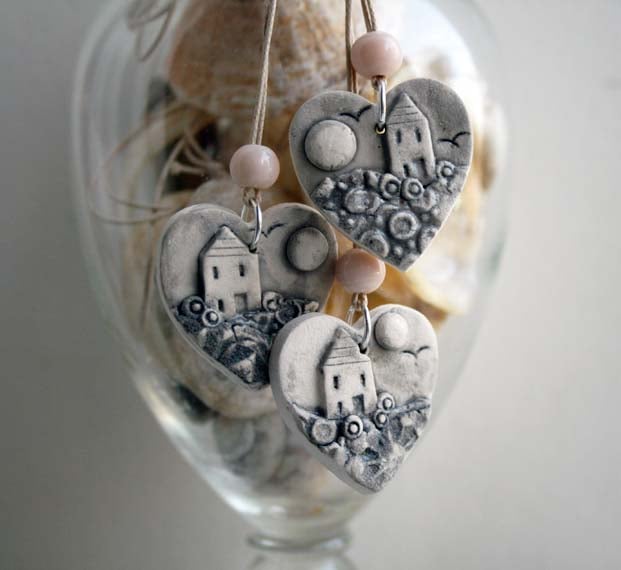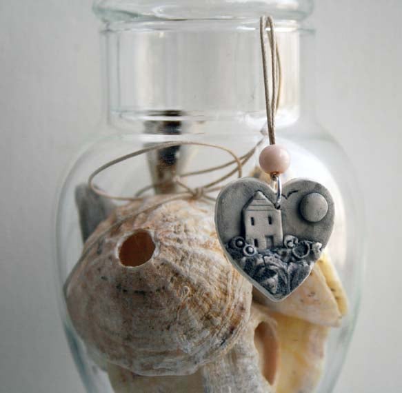 From my series of tiny landscapes jewellery, these little pendants have been created from textured leaves of porcelain, layered over each other, and embellished with added details to form a landscape scene of a hilltop cottage shrouded in a sea mist.