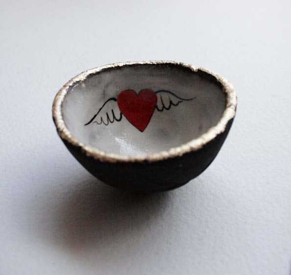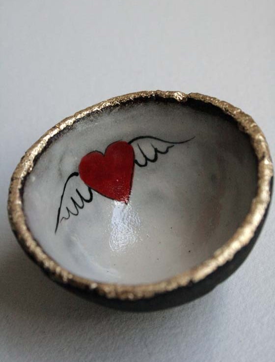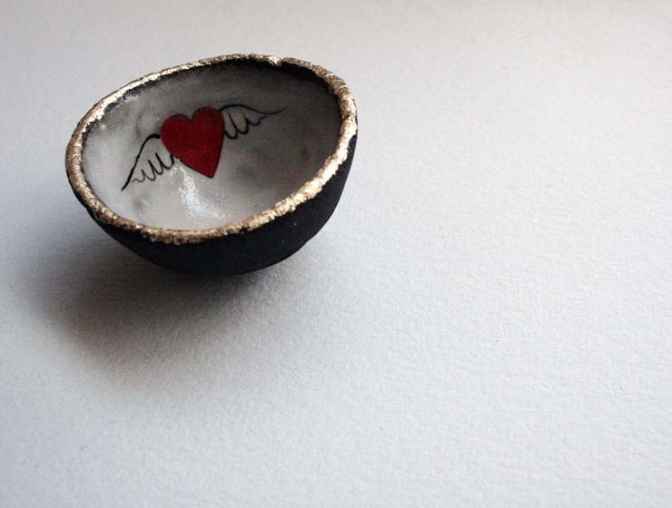 This bowl has been hand painted with under glaze colours to show a delicate little fluttering red heart, the perfect spot to hover over rings which can nestle in the bottom of the glazed interior. The rim has been given a distressed gold leafing which contrasts beautifully with the black clay.