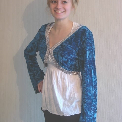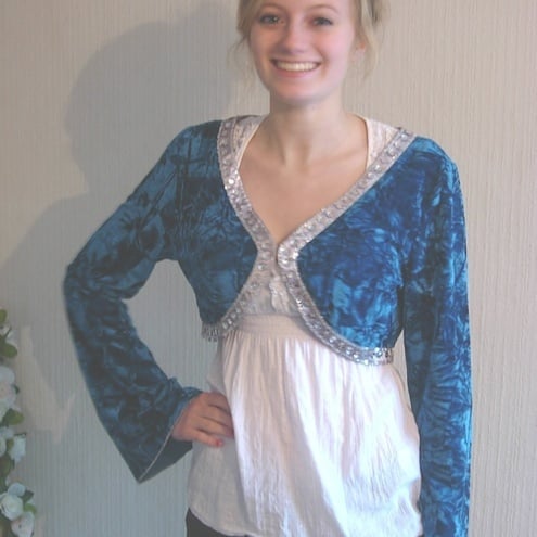 Stunning Turquoise crushed velvet shrug (bolero). This shrug has long Angel shaped sleeves and a silver beaded trim around a bolero style curved front edge. Now reduced down to £29!
