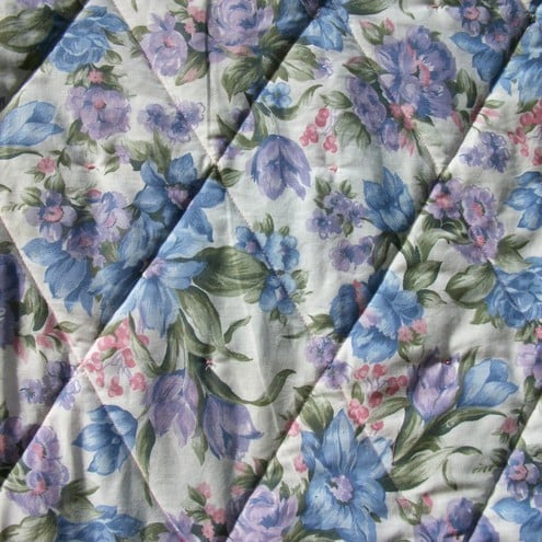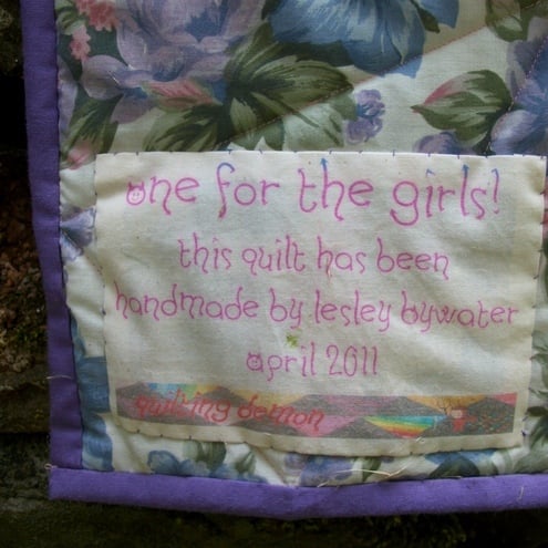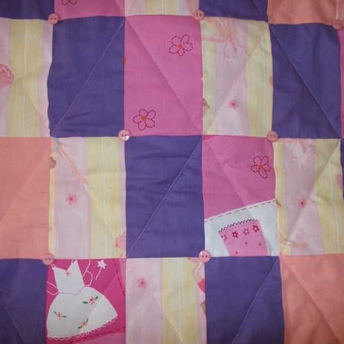 I designed and created this quilt, utilising a variety of plain cotton fabrics, mixed with Laura Ashley Ballet Country Furnishing cotton and Prestigious Textiles fabric to complete the quilt top. A 100% cotton flower print fabric is used to back the quilt, and I have used 2oz polyester batting. The all over diamond quilting design is completed on the sewing machine, with lots of decorative pink buttons sewn on to complete the design.The quilt measures 56" wide by 85" long, and is suitable for a single bed.