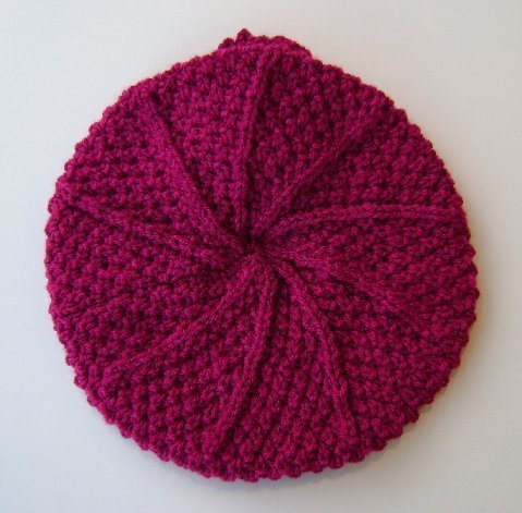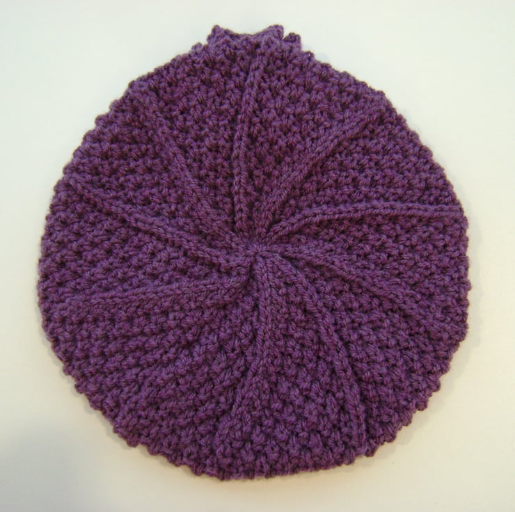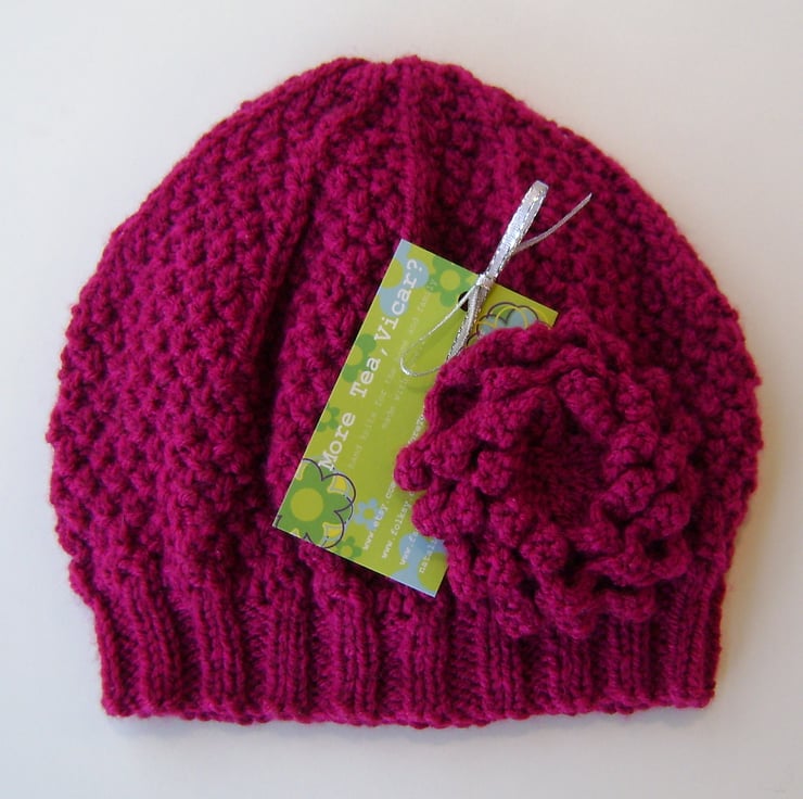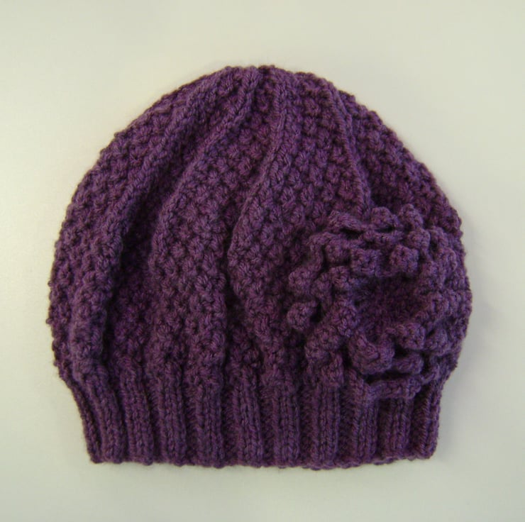 A lovely, stylish and cosy heather purple hand knitted ladies beanie hat with detachable heather purple flower brooch. It's knitted in a pretty rib and double moss stitch pattern.