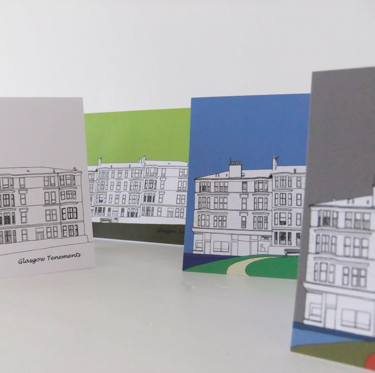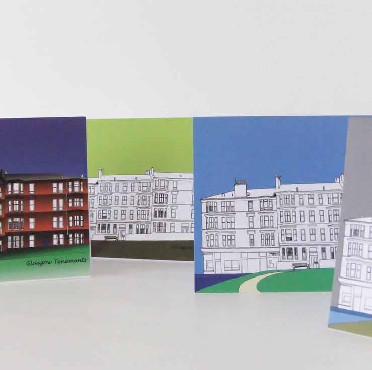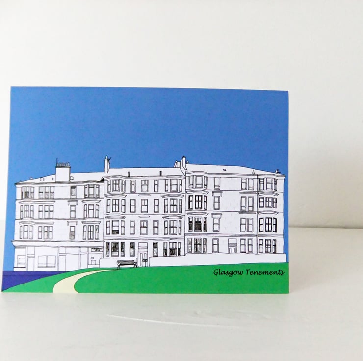 This listing is for ONE greeting card featuring a lovely line drawing of Glasgow tenements in the West End of Glasgow, Scotland. We have 5 colours available :