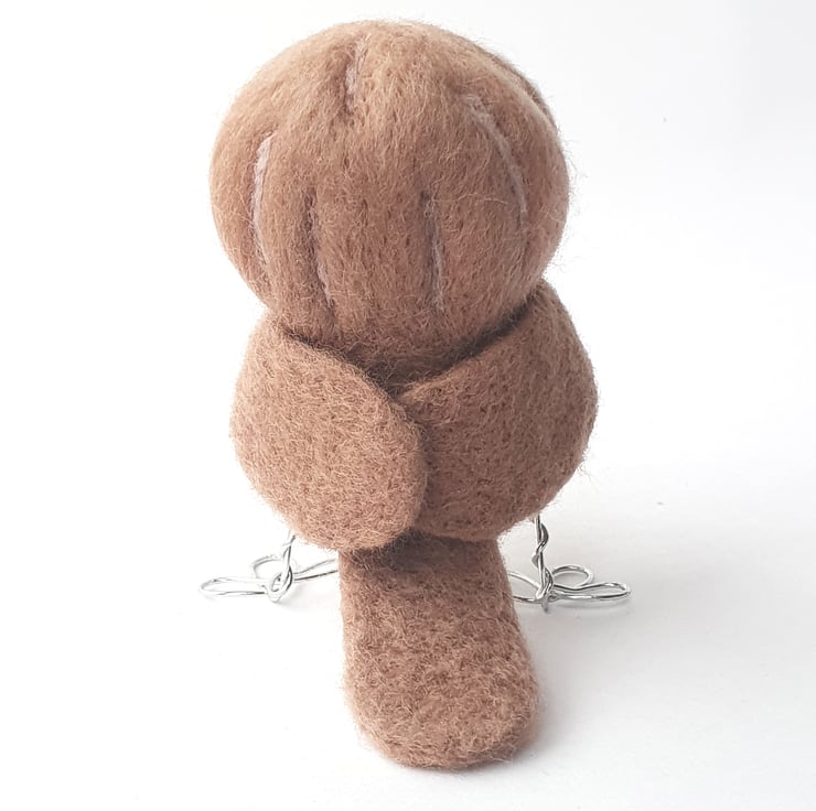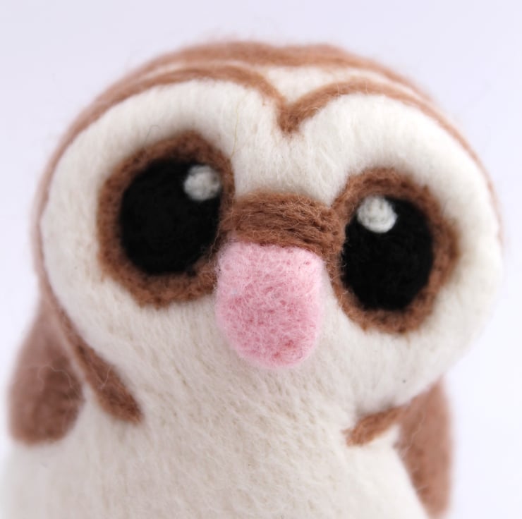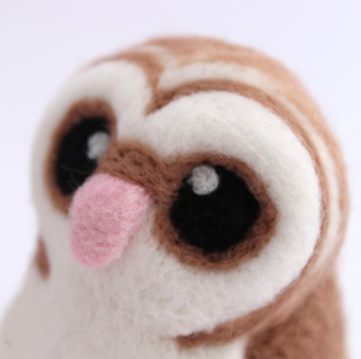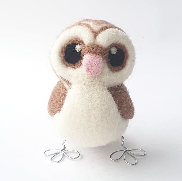 Barn Owl is approx 3.5 inches tall , he is made from lovely natural white and brown 100% organically farmed merino wool tops with little pink and black accents for beak and eyes and has little silver coloured wire legs!