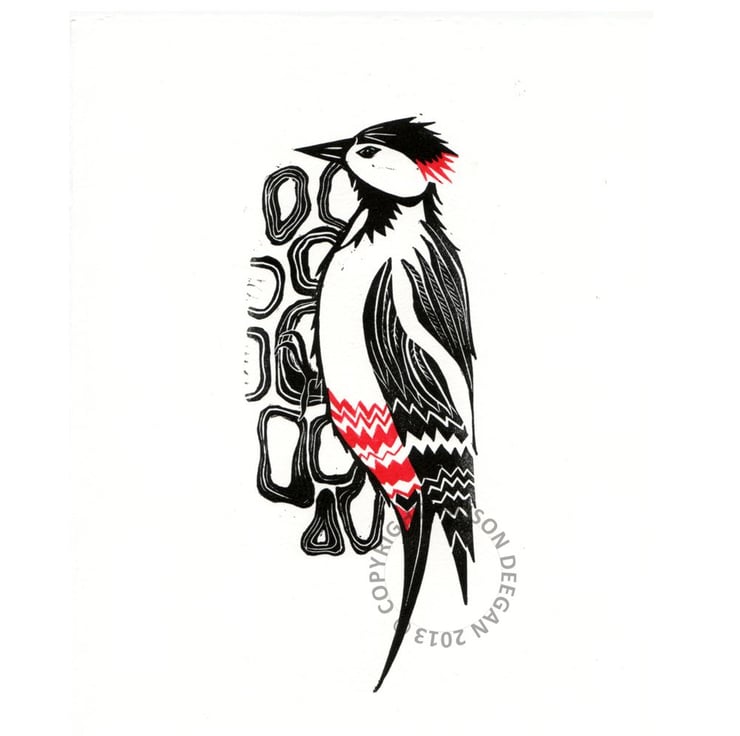 This is an original lino print printed with black oil-based inks onto Zerkall printing paper and embellished by hand with red drawing ink. The print size is approximately 27x23cm and the starling is about 20cm from the crown of his head to the end of his tail. It will be signed, number and dated in pencil.