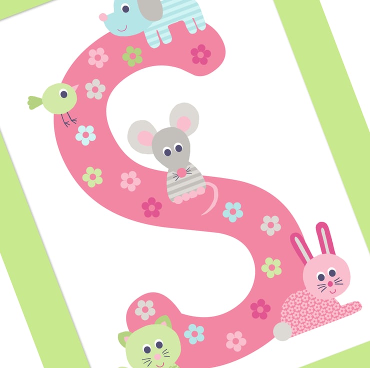 This gorgeous personalised framed print features your child's initial with a puppy, kitten, rabbit, mouse and little bird playing around it. The picture comes with a complimentary green mount and comes in a white contemporary frame.