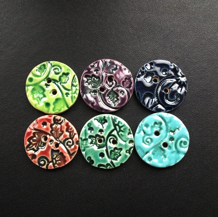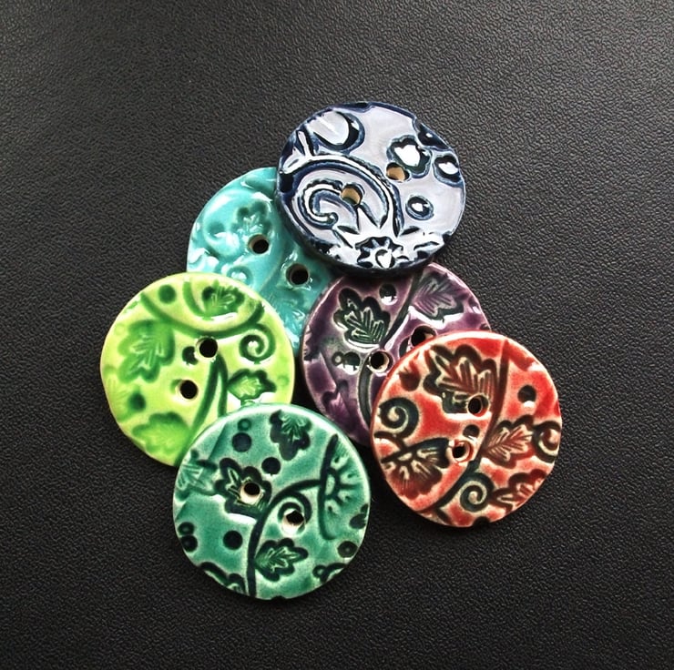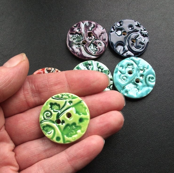 This set of six buttons are made from white earthenware clay, embossed and glazed to 1100 degrees, so nice and strong.