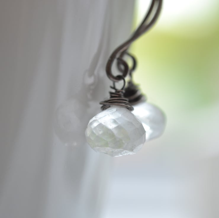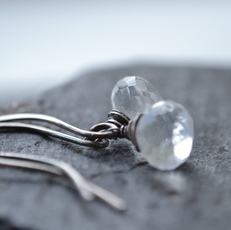 All handmade by me in my little home studio. These gorgeous facetted crystal quartz "onion" briolettes are wrapped in sterling silver wire and dangle from handmade earwires. All the silver has been oxidised and handpolished (for aaaaaages) to give a gorgeous deep colour and shine.