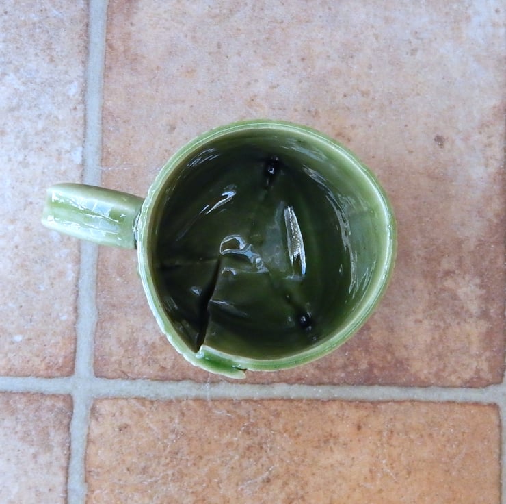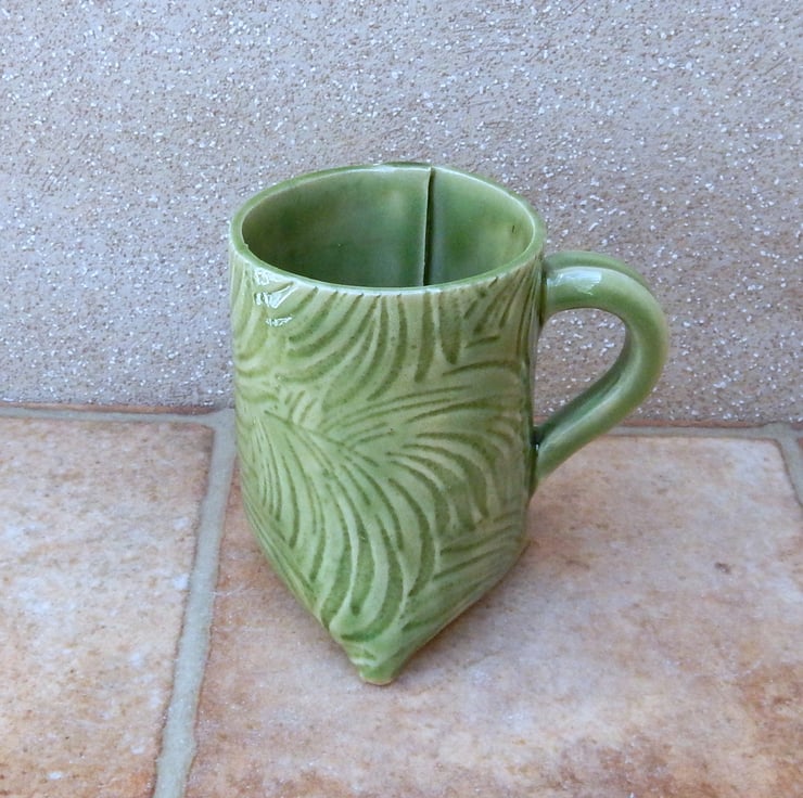This fun mug was made using a rolled out piece of strong white stoneware clay which I have cut and folded it into a tripod shape .