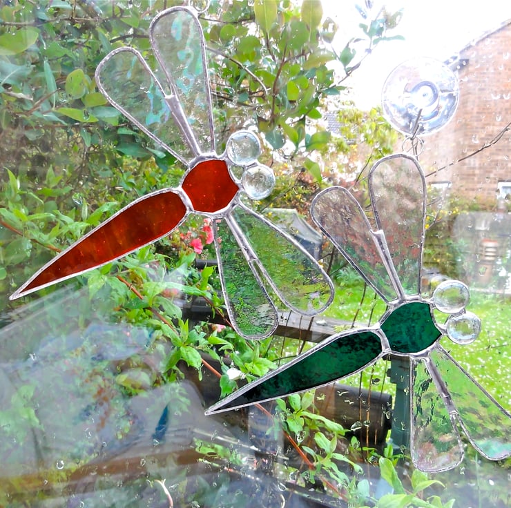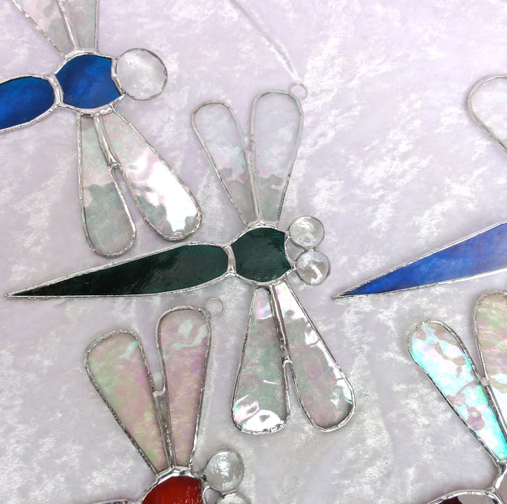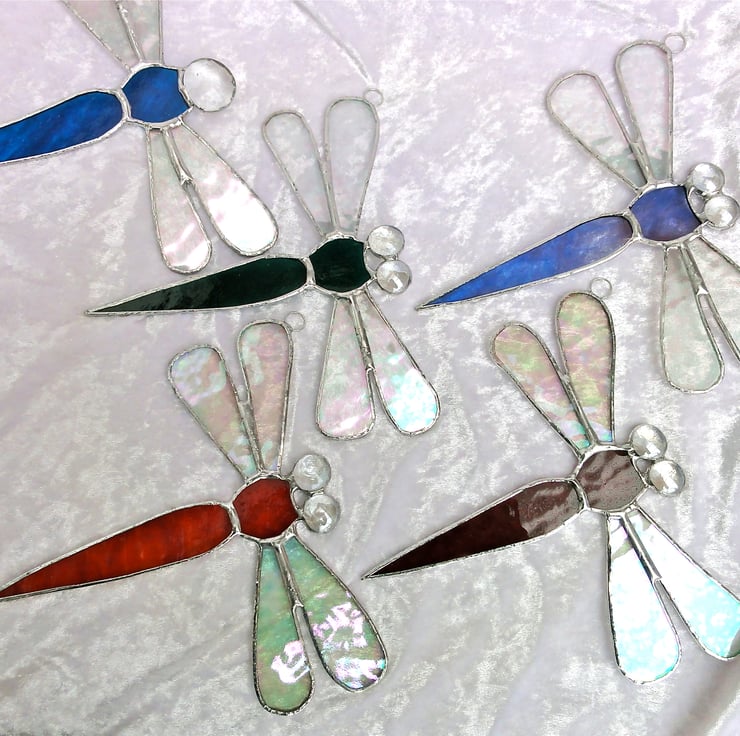 In this listing I have dragonflies made out of the following glass; dark rose textured glass, pink and blue streaky glass (which looks lilac) dark green hammered glass and two blue streaky glass (which looks turquoise, the wings have been made from irridised granite back glass. (Please note I only have the dark rose suncatcher left)