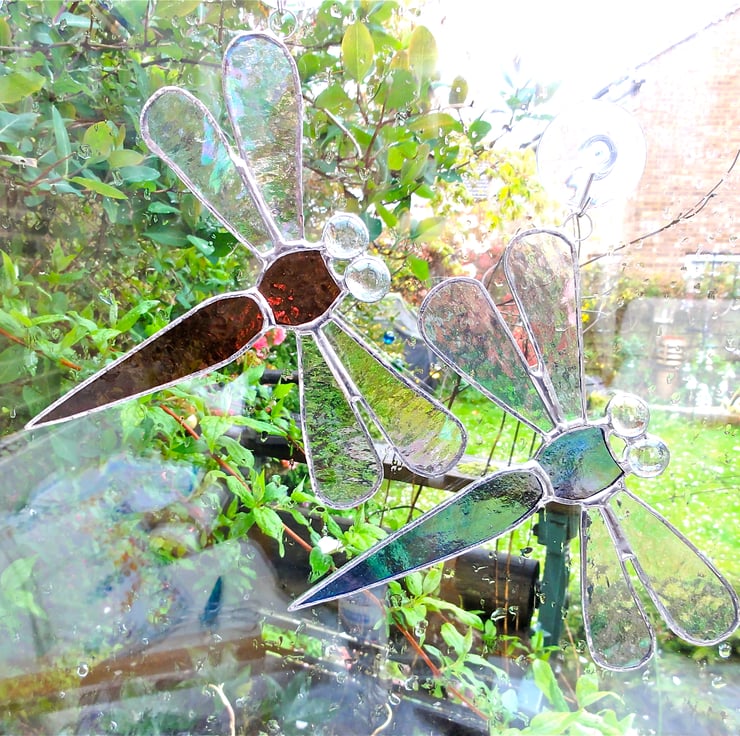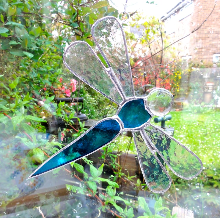 The eyes have been made from clear nuggets. Each piece of glass has been copper folded and soldered together, a ring has been attached for hanging purposes. I will supply a good quality window hook for hanging purposes, please never use the small or cheeper variety as these will fall and your dragonfly may break.