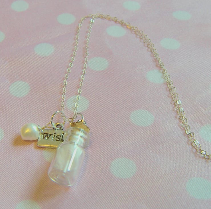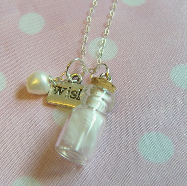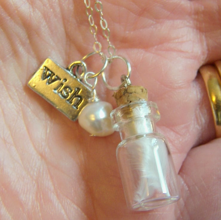Description: Tiny little glass vial with cork stopper measures approx 2cm x 1cm, inside are 2 soft fluffy white marabou feathers, these represent angel wings, hangs from an 18" 925 sterling silver chain along with ivory freshwater pearl and silver wish charm