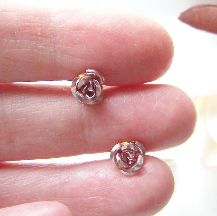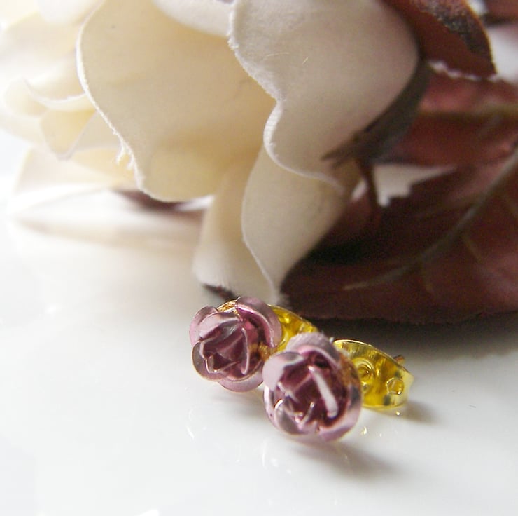 Description: Cute dainty pink rose earrings on goldtone stud posts with butterfly backs, (also available in red see other listing)