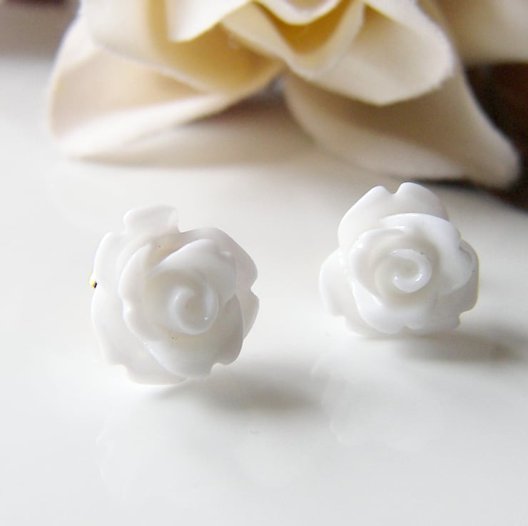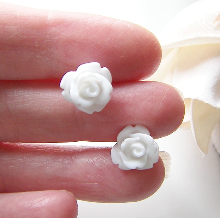 Description: Snow White rose earrings on goldtone stud posts with butterfly backs, so pretty and dainty, your ears will love these!! (matching bobby pins available see other listings)