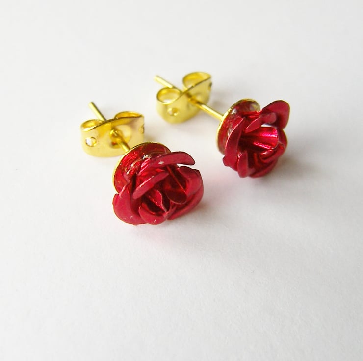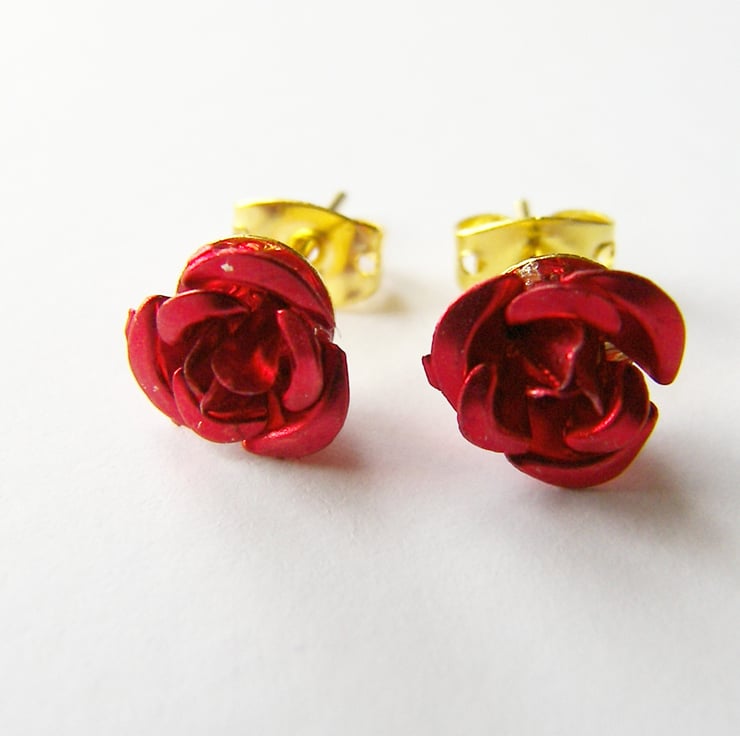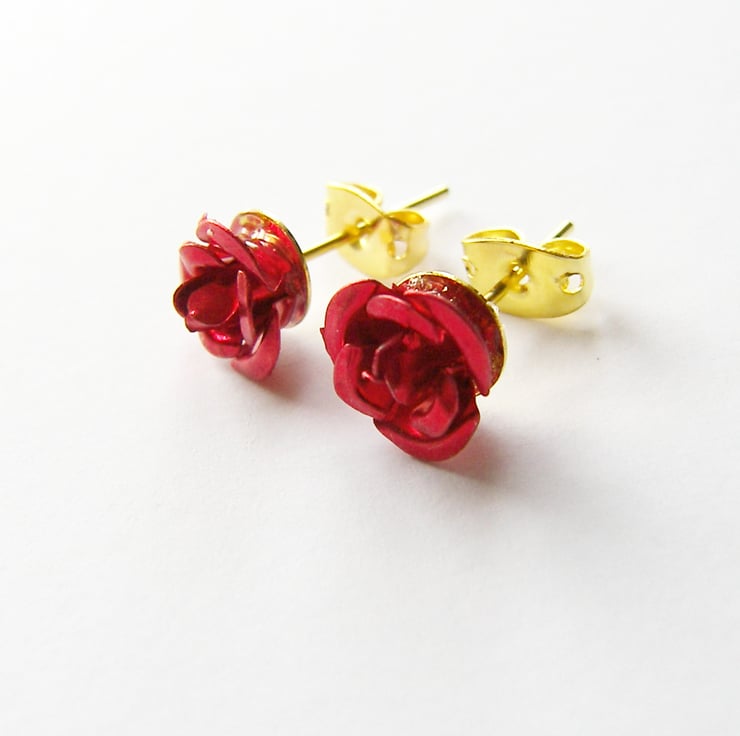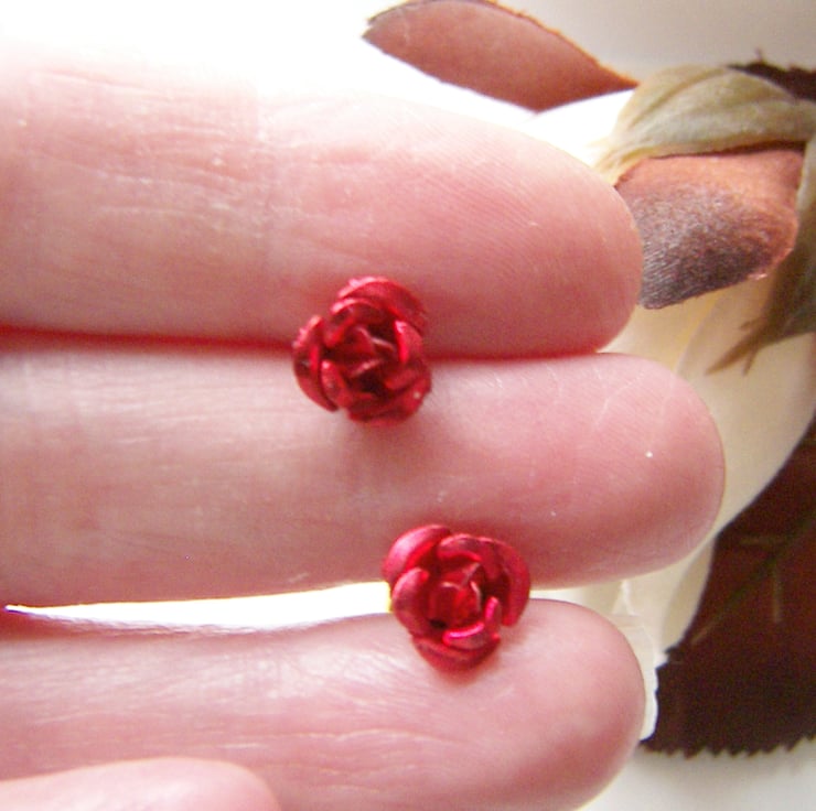 Description: Cute dainty red rose earrings on goldtone stud posts with butterfly backs, so pretty, dainty and feminine, these are also availabe in pink (matching bobby pins available see other listings)