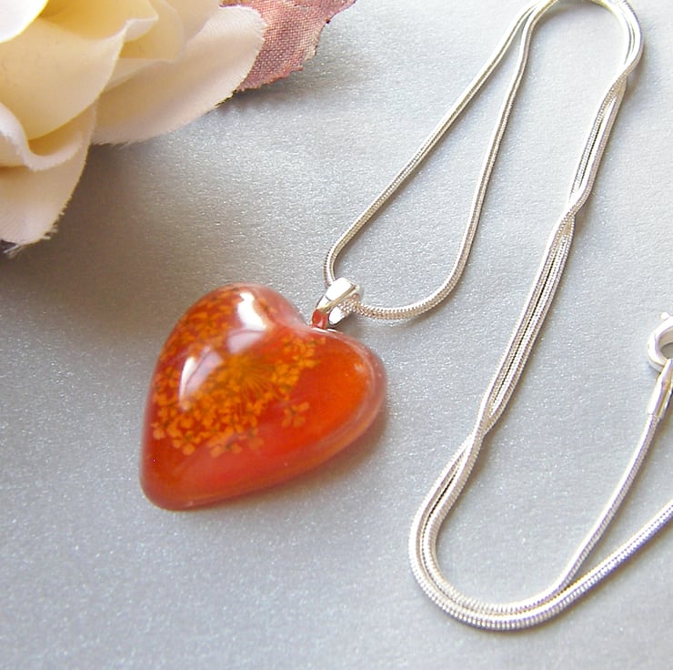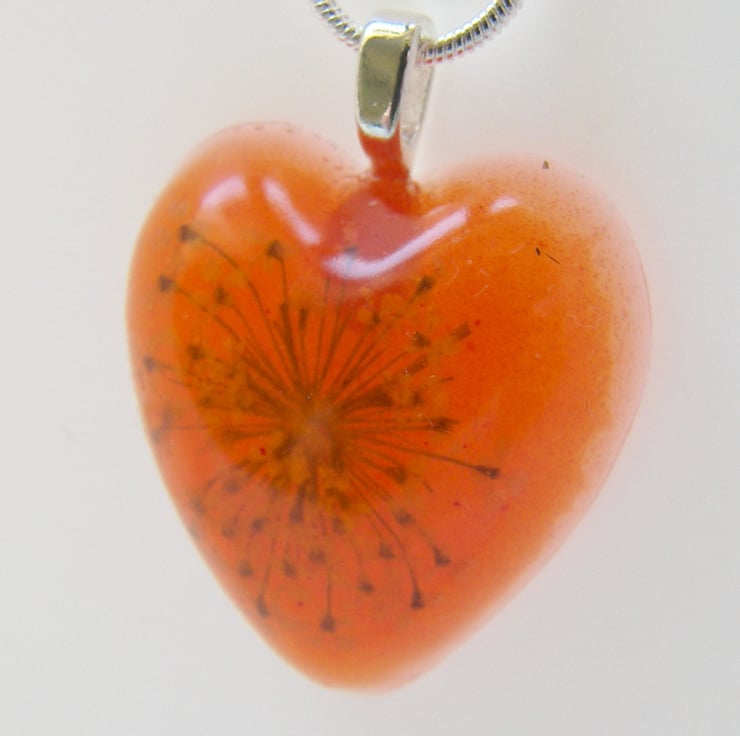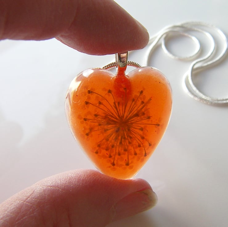 Description: I have very carefully dried and treated this lovely queen Annes Lace then sealed in UV resistant, non toxic resin and added a touch of orange dye. Pendant is heart shaped and measures approx 34mm x 28mm, (almost 1.5" x just over 1") hangs on an 18" silver plated chain (So cheery and bright for summer time:)