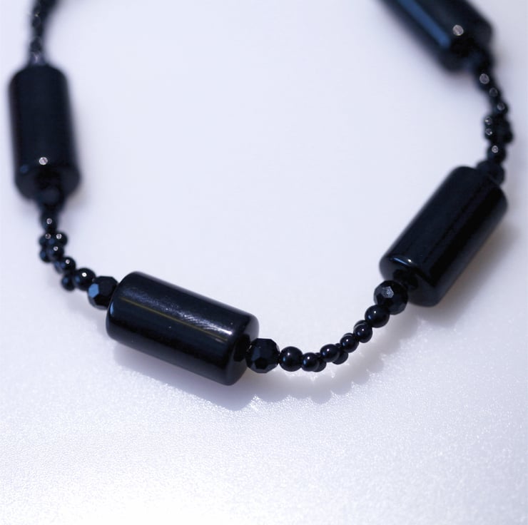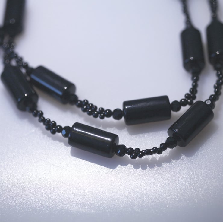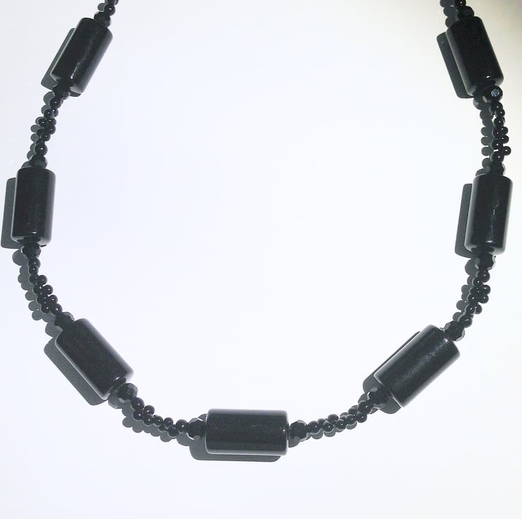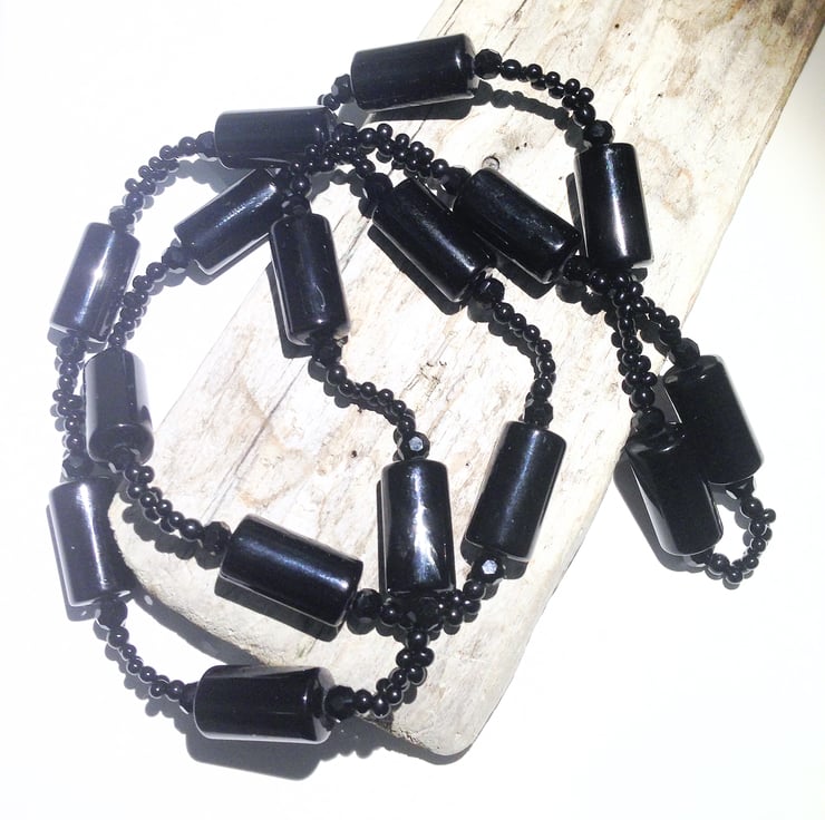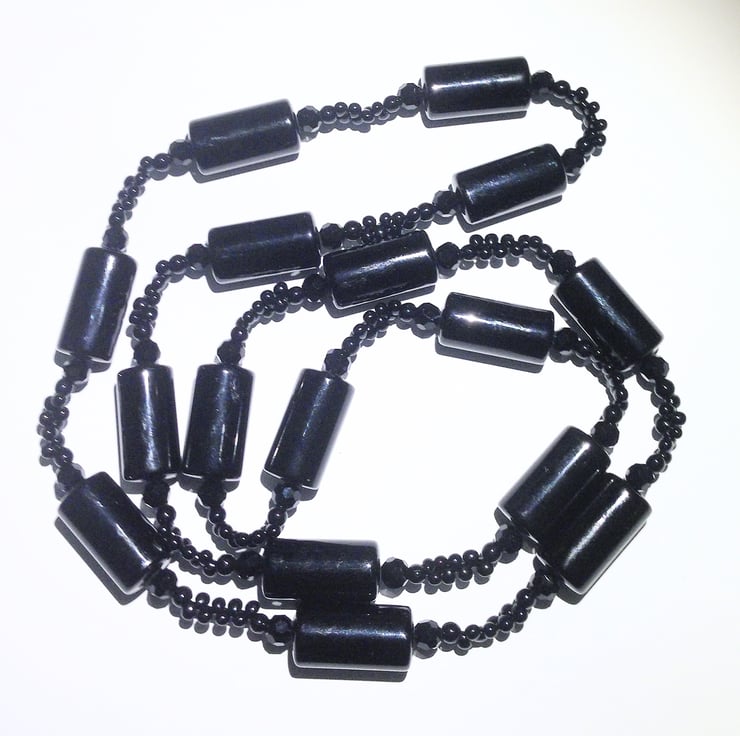 This long black bead necklace (approximately 86 cm round) is hand made from a variety of beads - large black cylindrical beads (approximately 2 cm x 1 cm) multi-facetted and round glass beads and tear drop shaped seed bead which form an interesting and unusual design.