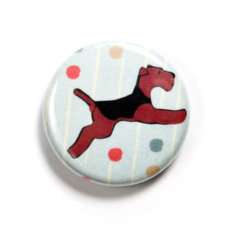 Cute Flying Welsh Terrier on a lovely shiny badge with a metal pin back.