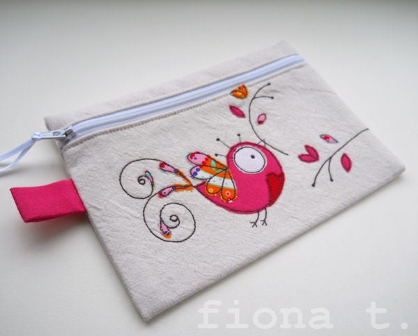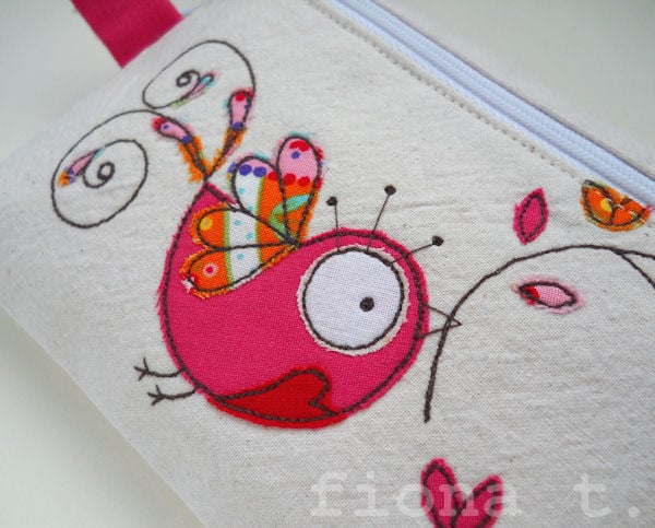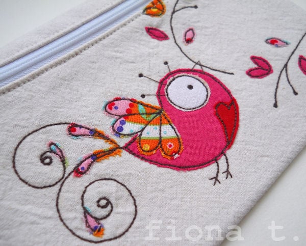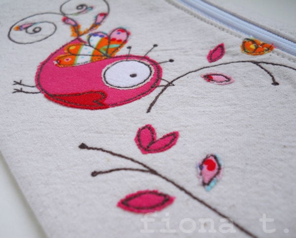 the cotton fabrics are layered and appliqued onto pre-washed calico, and the intricate details drawn on with free machine (free motion) embroidery, before i make up the finished item.