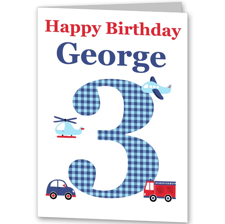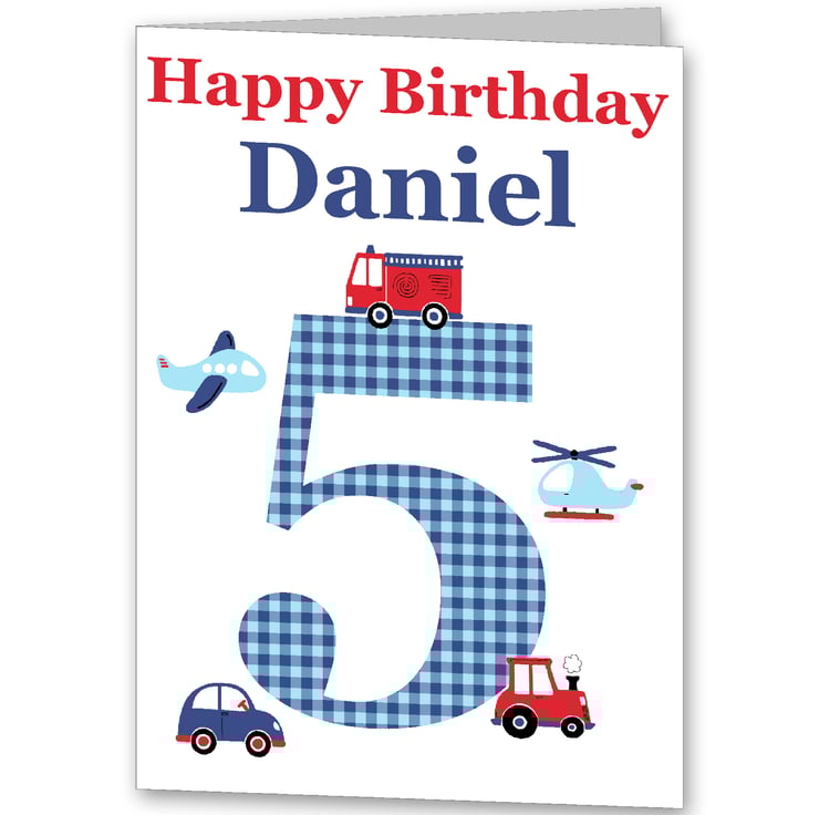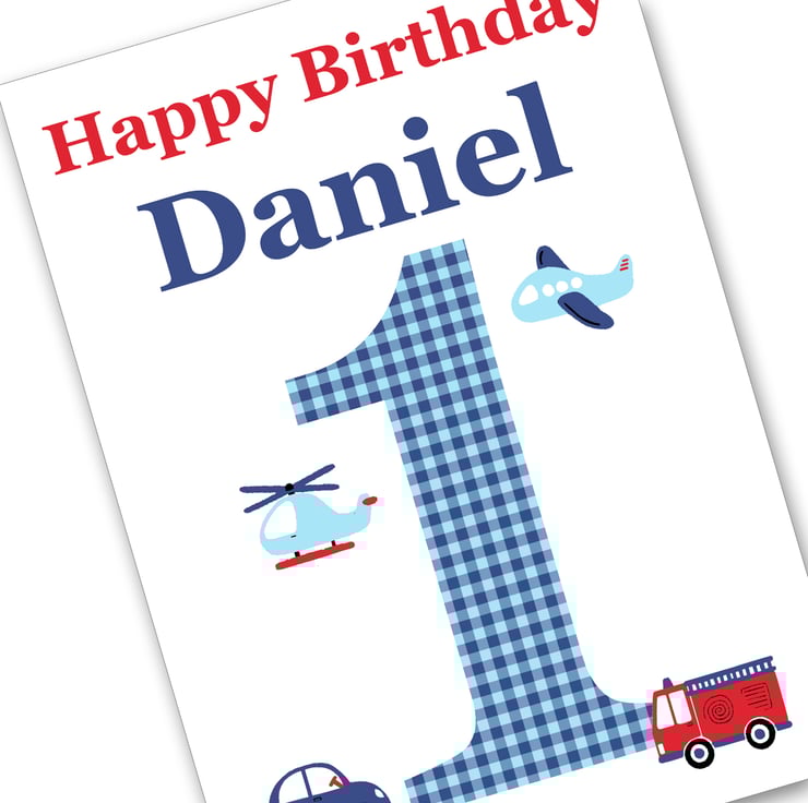 This personalised transport birthday card is for any little boy who loves all things with wheels! It features the child's age with a fire engine, car, tractor, aeroplane and helicopter flying or driving around it. It is also personalised with their name and a Happy Birthday message.