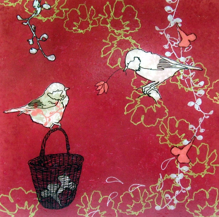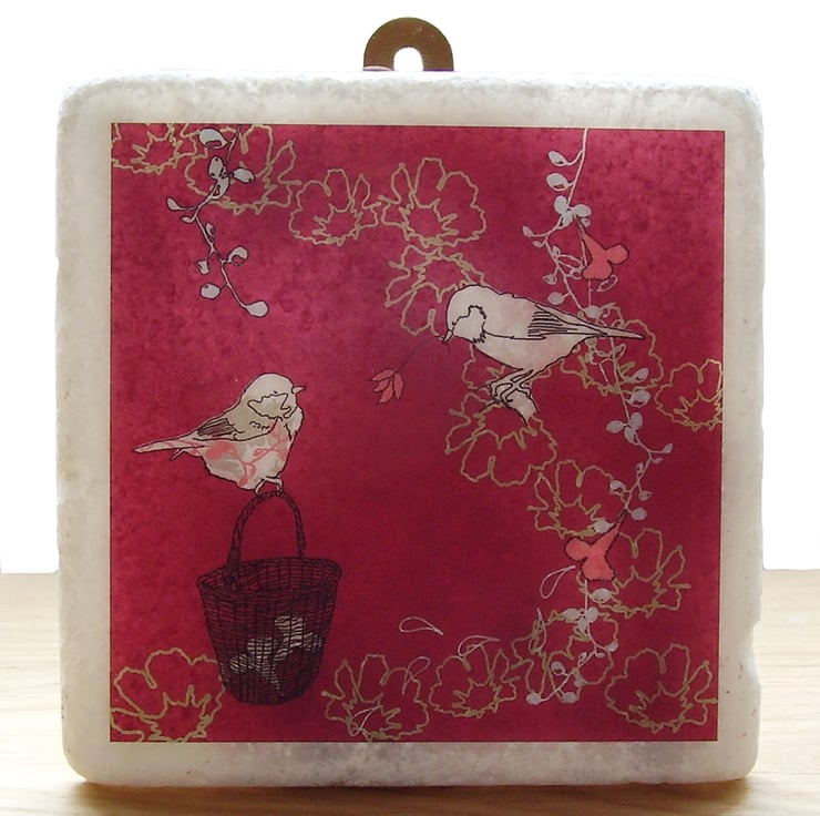 white marble tile featuring an original 'littlebirdy' design to hang on your wall!