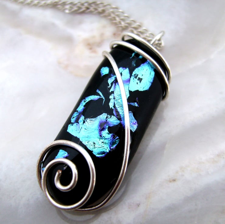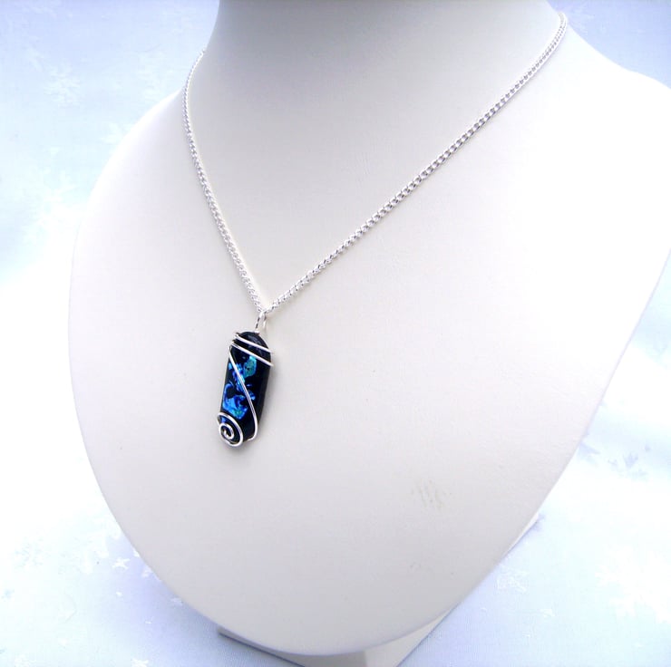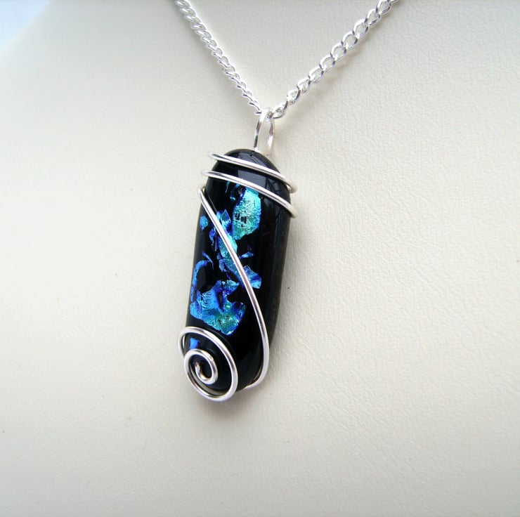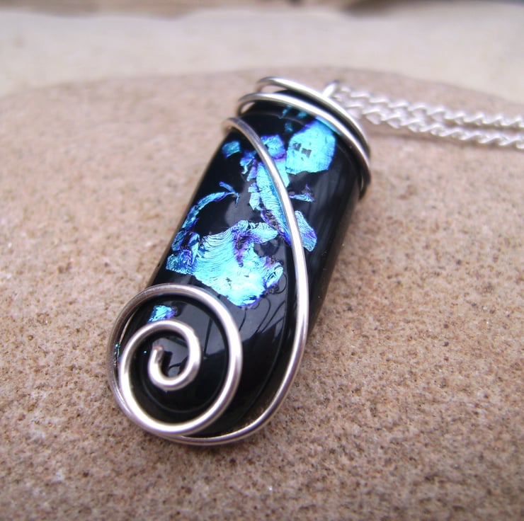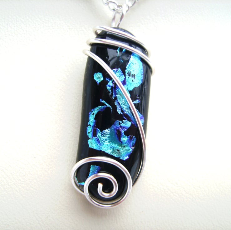 This unique pendant has been created by fusing pieces of blue dichroic glass with black glass & then wire wrapping it with silver plated wire. It is hung on a silver plated 18 inch chain & comes with a velveteen gift box. The glass pendant is approximately 3cm by 1cm.