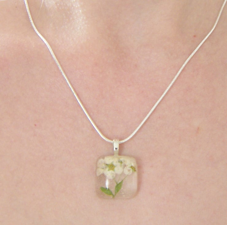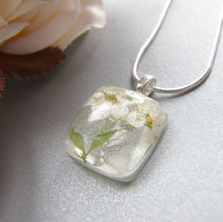 Description: I have very carefully dried and pressed this pretty Mayflower (treated to retain colour, before sealing in UV resistant, non toxic resin. Pendant measures approx 25mm x 20mm, (almost 1" x 0.75") hangs on an 18" silver plated chain (So pretty and just perfect for the coming month of May:) great bridal gift, birthday gift or just to treat yourself:)