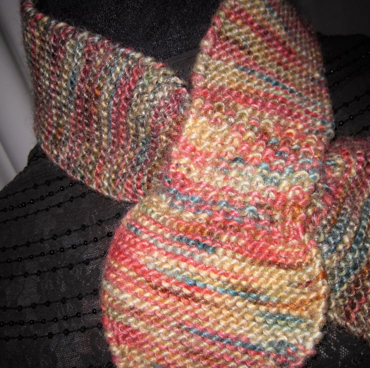 The yarn is a pretty mixture of pastel blues, lemons and pinks subtly graduating over the piece to darker pinks, reds and greys making this a really versatile accessory.