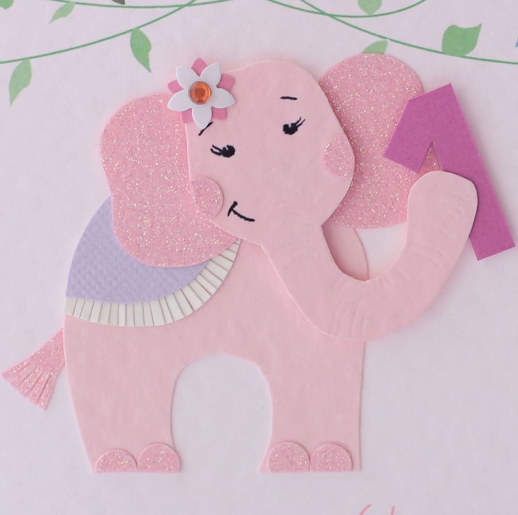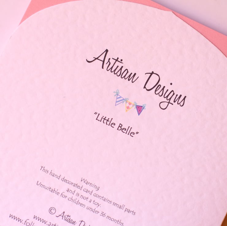 Little Belle is handcut from pale pink hammered card and has pink sparkly toes, tail and ears, and is wearing a cute sparkly flower. She holds a handcut age number of your choice in raspberry coloured card.