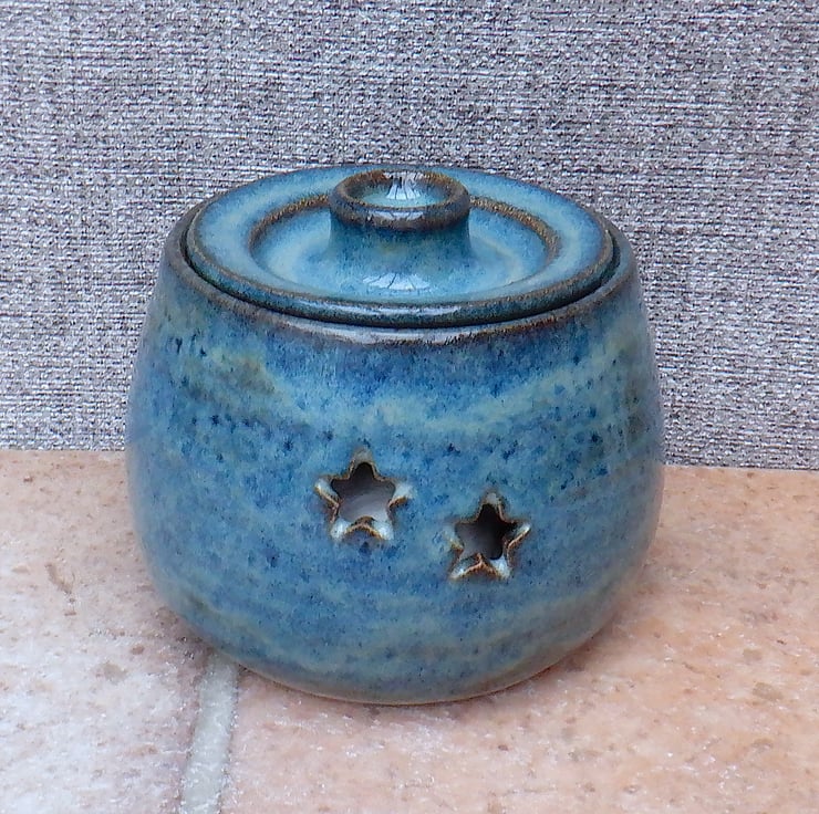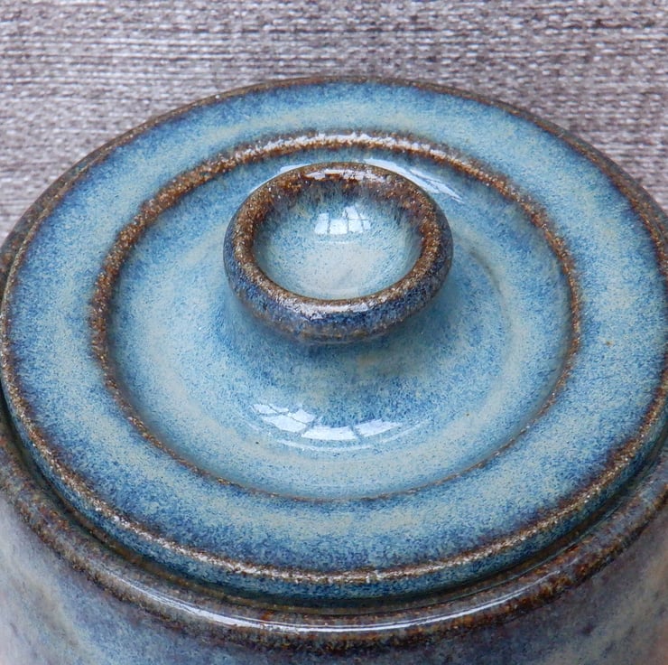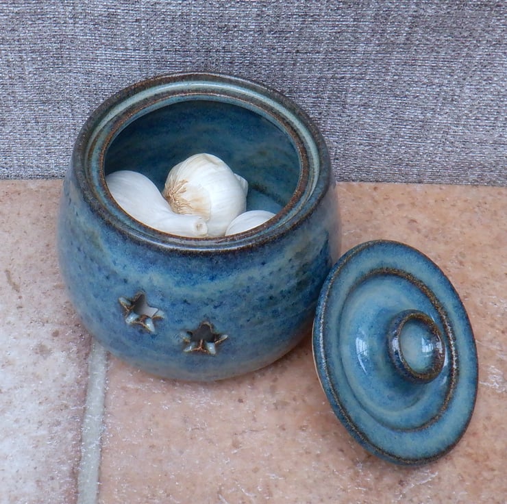 I threw this garlic storage jar on my pottery wheel using strong ivory stoneware clay and have finished it in a lovely combination of light green celadon, and jade green reactive glaze.