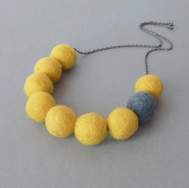 Punctuated with a single grey ball, this chunky, bright yellow necklace is great for making a statement. The light-weight, felt beads are spaced with tiny, grey glass beads.