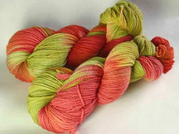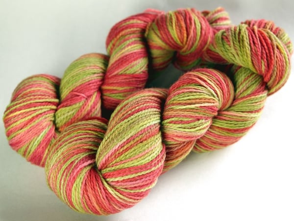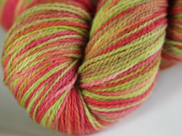 Shades of yellow-green, chartreuse, lime, orange, pink and orangey-pinky red. These are a big, squashy, soft skeins of two-ply merino sport/sock yarn - despite its huge appearance it works up as a thick-ish sock yarn. There is one skein left.