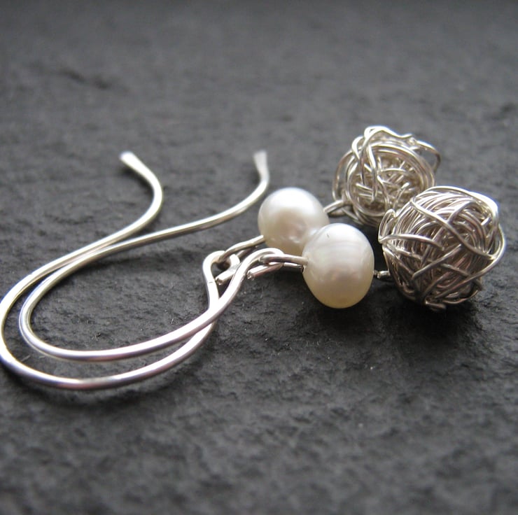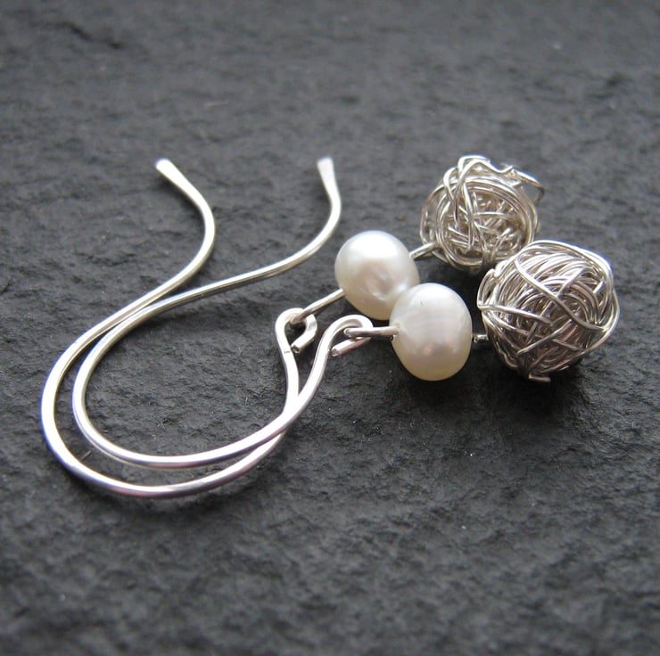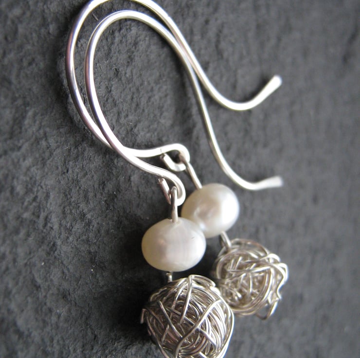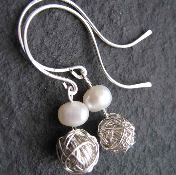 Beautiful earrings fully handcrafted using sterling silver wire, wrapped to form a ball shape and hung from a single ivory freshwater pearl to form the lovely drop shape. The ear hooks are hand formed and lightly hammered to shape and harden.