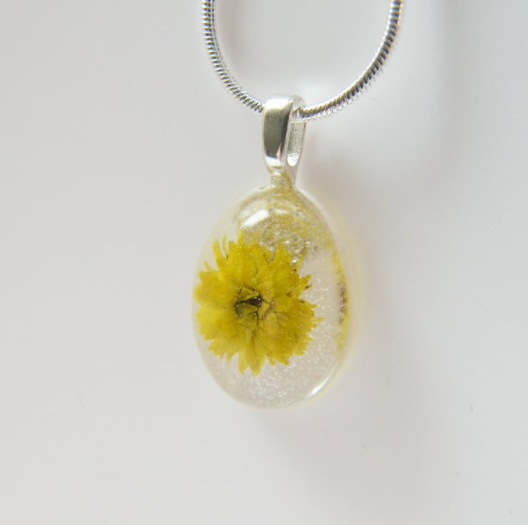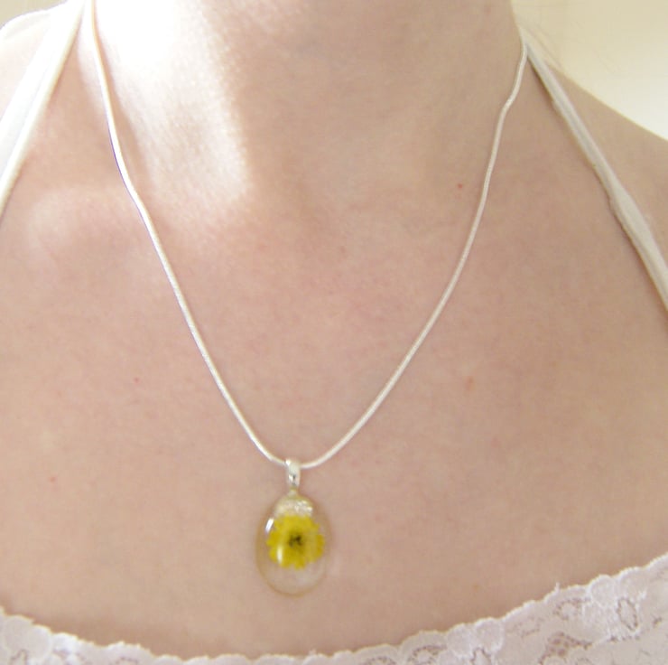 Description: I have very carefully treated this dainty little real yellow flower to retain its beautiful color before sealing in UV resistant, non toxic resin. Pendant measures approx 28mm x 17mm, (just over 1" x just over 0.5")) hangs on an 18" silver plated chain (very pretty, summery dainty little necklace:)